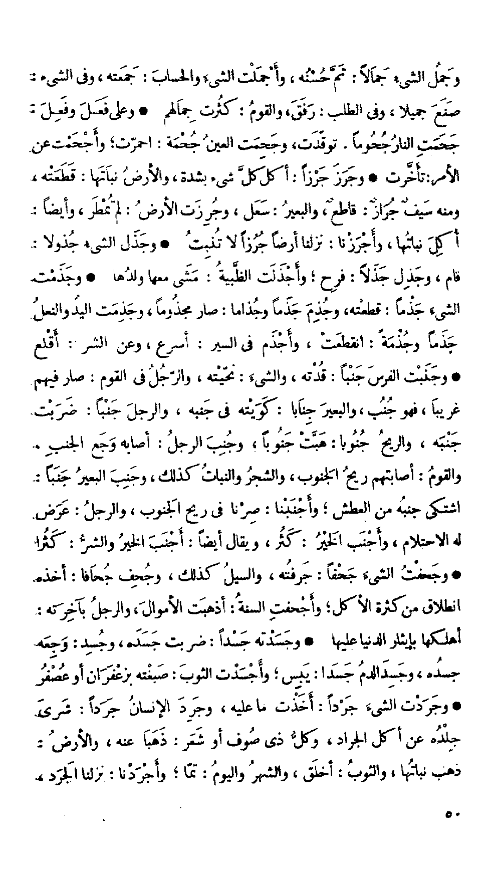 • وجنبت الفرس جنباً: قدته، والشيء: نحيته، والرجل في القوم: صار فيهم غريبا، فهو جنب، والبعير جنابا: كويته في جنبه، والرجل جنباً: ضربت جنبه، والريح جنوبا: هبت جنوباً، وجنب الرجل: أصابه وجع الجنب. والقوم: أصابتهم ريح الجنوب، والشجر والنبات كذلك، وجنب البعير جنباً: اشتكى جنبه من العطش؛ وأجنبنا: صرنا في ريح الجنوب، والرجل: عرض له الاحتلام، وأجنب الخير: كثر، ويقال أيضاً: أجنب الخير والشر: كثرا
