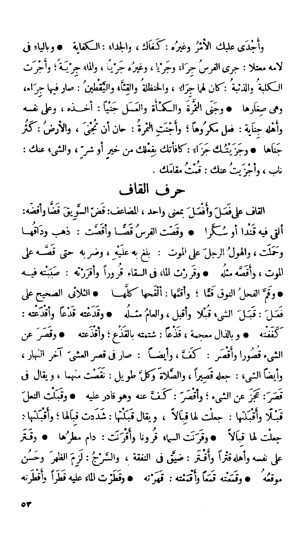 • وبالياء في لامه معتلاً: جرى الفرس جرا، وجريا، وغيره جرياً، والماء جرية؛ وأجرت الكلبة والذئبة: كان لها جراه، والحنظلة والقثاء واليقطين: صار فيها جراء، وهي صغارها