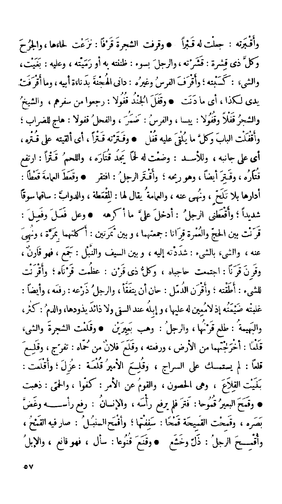 • وعلى فَعَلَ وفَعَلَ: قرنت بين الحج والعمرة قرانا: جمعتهما، وبين ثمرتين: أكلتهما بمرة، ونمهى عنه، والشيء بالشيء: شددته إليه، وبين السيف والنبل: جمع، فهو قارنٌ، وقرن قرناً: اجتمعت حاجباه، وكل ذي قرن: عظمت قرناه؛ وأقرنت للشيء: أطقته؛ وأقرن الدمل: حان أن يتفقأ، والرجل ذرعه: رفعه، وأيضاً: غلبته ضيعته إذ لا معين له عليها، وإبله عند السقى ولا ذائد يذودها، والدم: كثر، والبهيمة: طلع قرنها، والرجل: وهب بعيرين