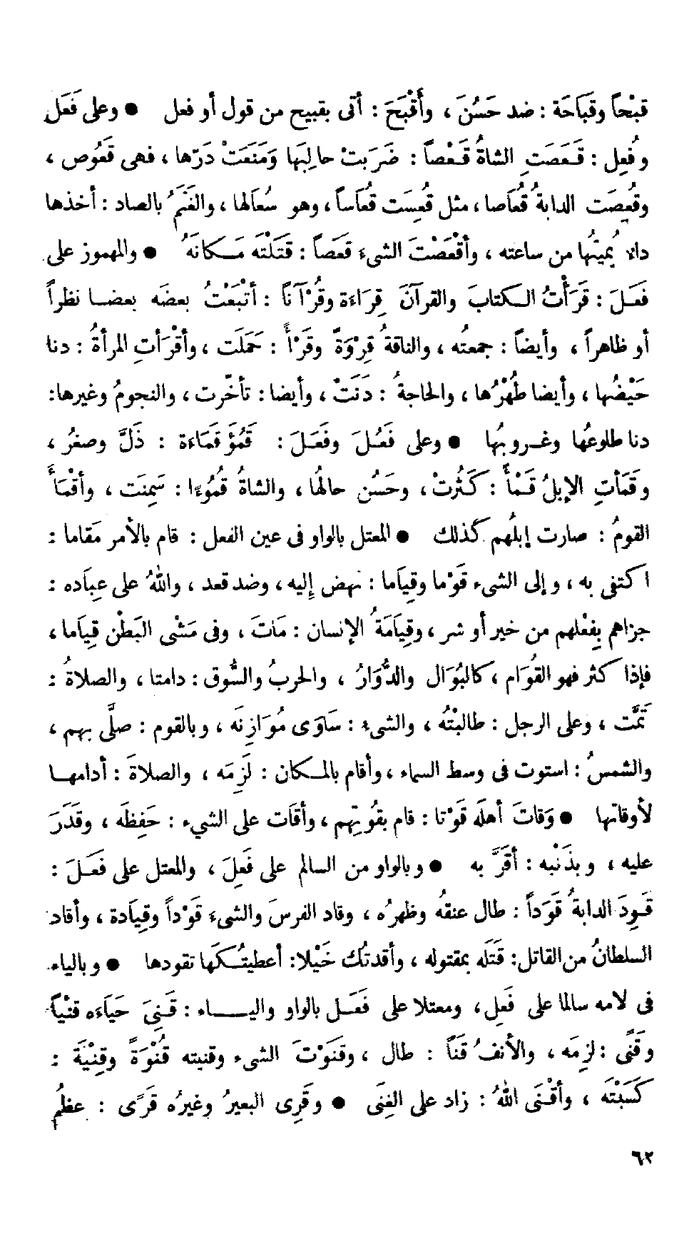 • المعتل بالواو في عين الفعل: قام بالأمر مقاماً: اكتفى به، وإلى الشيء قوماً وقياماً: نهض إليه، وضد قعد، والله على عباده: جزاهم بفعلهم من خير أو شر، وقيامة الإنسان: مات، وفي مشي البطن قياماً، فإذا كثر فهو القوام، كالبوال والدوار، والحرب والسوق: دامتا، والصلاة: تمت، وعلى الرجل: طالبته، والشيء: ساوى موازنه، وبالقوم: صلَّى بهم، والشمس: استوت في وسط السماء، وأقام بالمكان: لزمه، والصلاة: أدامها لأوقاتها