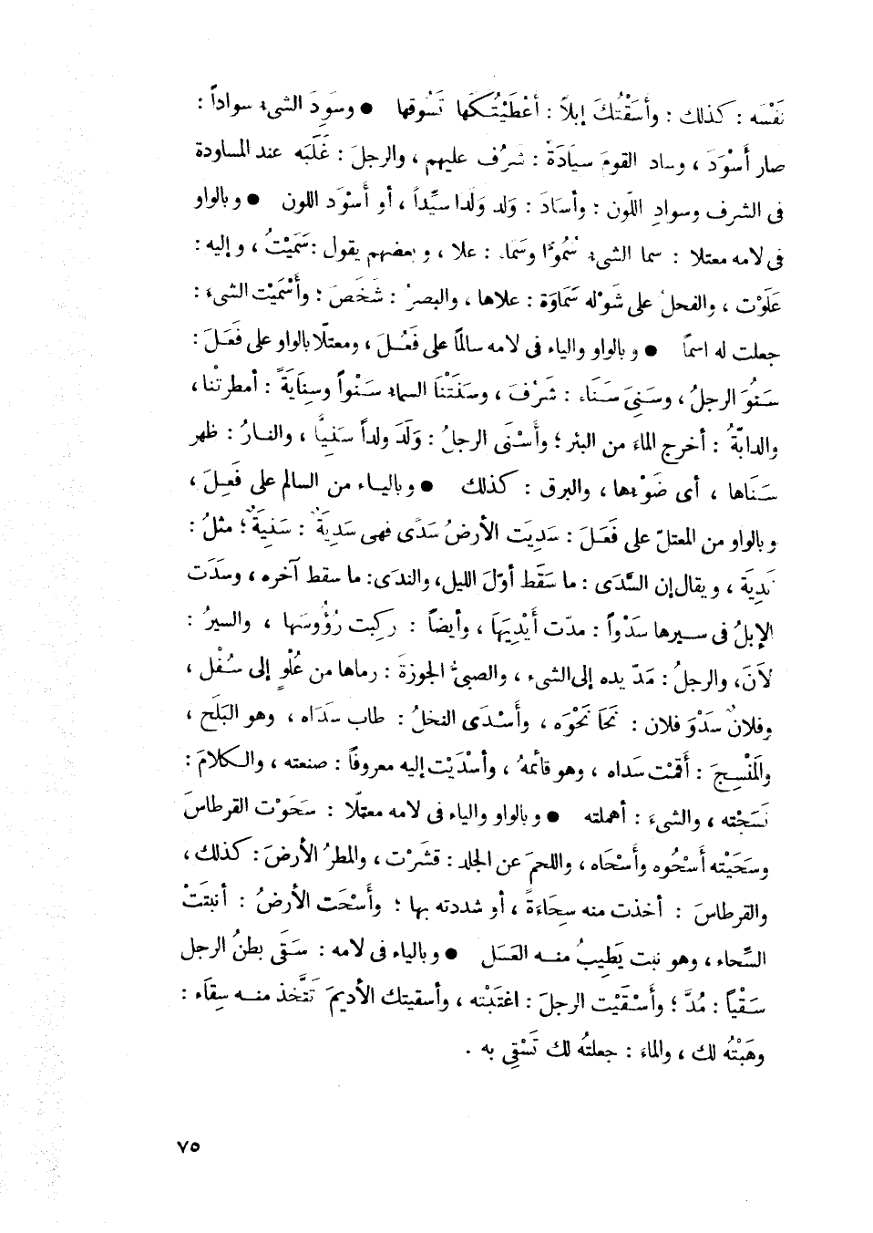 • وبالياء من السالم على فَعِلَ، وبالواو من المعتل على فَعَلَ: سديت الأرض سدى فهيى سدية: سنيةٌ؛ مثل: ندية، ويقال إن السدى: ما سقط أول الليل، والندى: ما سقط آخره، وسدت الإبل في سيرها سدواً: مدت أيديها، وأيضاً: ركبت رؤوسها، والسير: لان، والرجل: مد يده إلى الشيء، والضبي الجوزة: رماها من علوٍ إلى سفل، وفلانٌ سدو فلان: نحا نحوه، وأسدى النخل: طاب سداه، وهو البلح، المنسج: أقمت سداه، وهو قائمه، وأسديت إليه معروفاً: صنعته، والكلام: نسجته، والشيء: أهملته