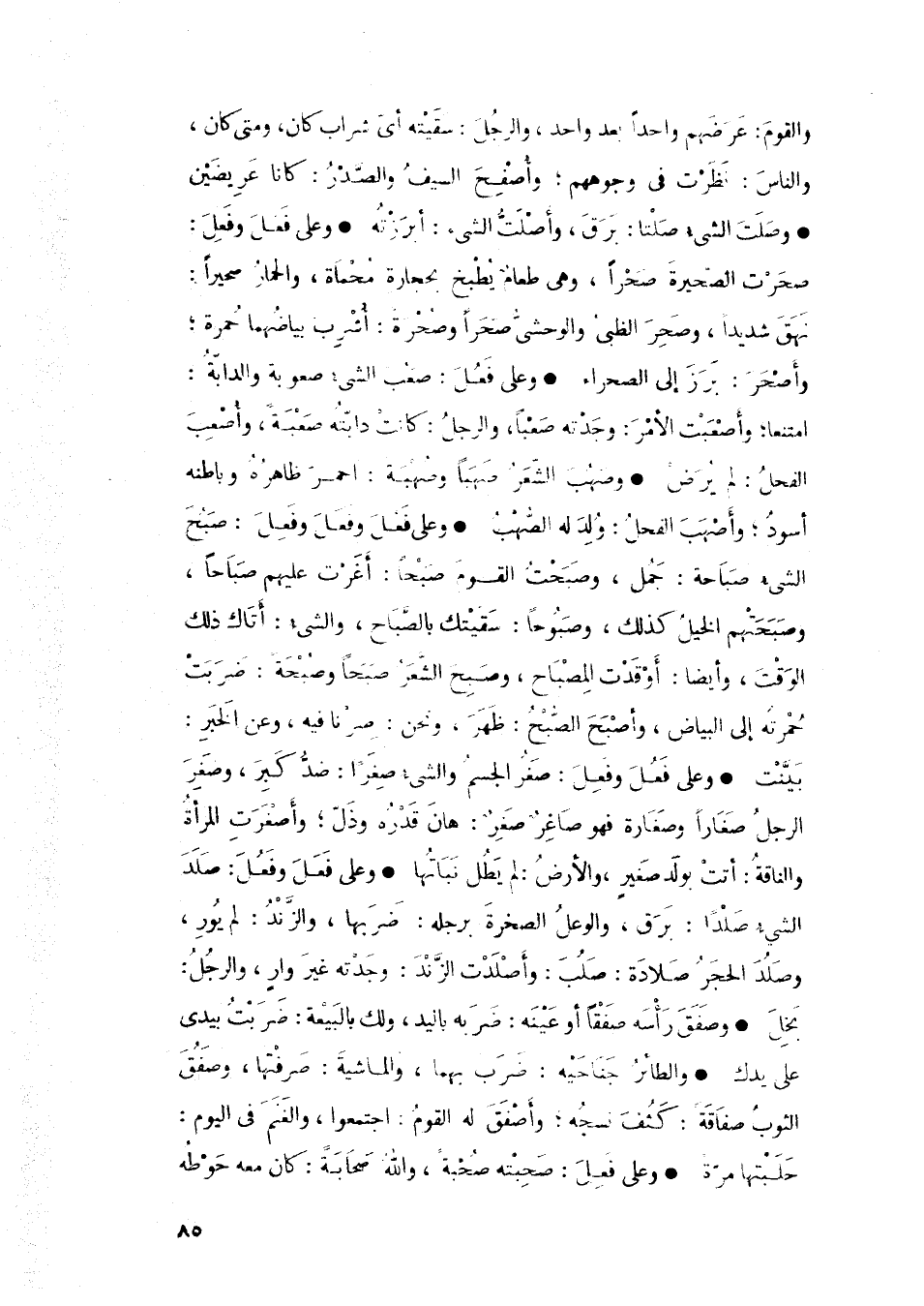 • وعلى فَعْلَ وفَعَلَ وفَعِلَ: صبح الشيء صباحه: جمل، وصبحت القوم صبحاً: أغرت عليهم صباحاً، وصبحتهم الخيل كذلك، وصبوحاً: سقيتك بالصباح، والشيء: أتاك ذلك الوقت، وأيضاً: أوقدت المصباح، وصبح لشعر صبحاً وصبحة: ضربت حمرته إلى البياض، وأصبح الصبح: ظهر، ونحن: صرنا فيه، وعن الخبر: بينت
