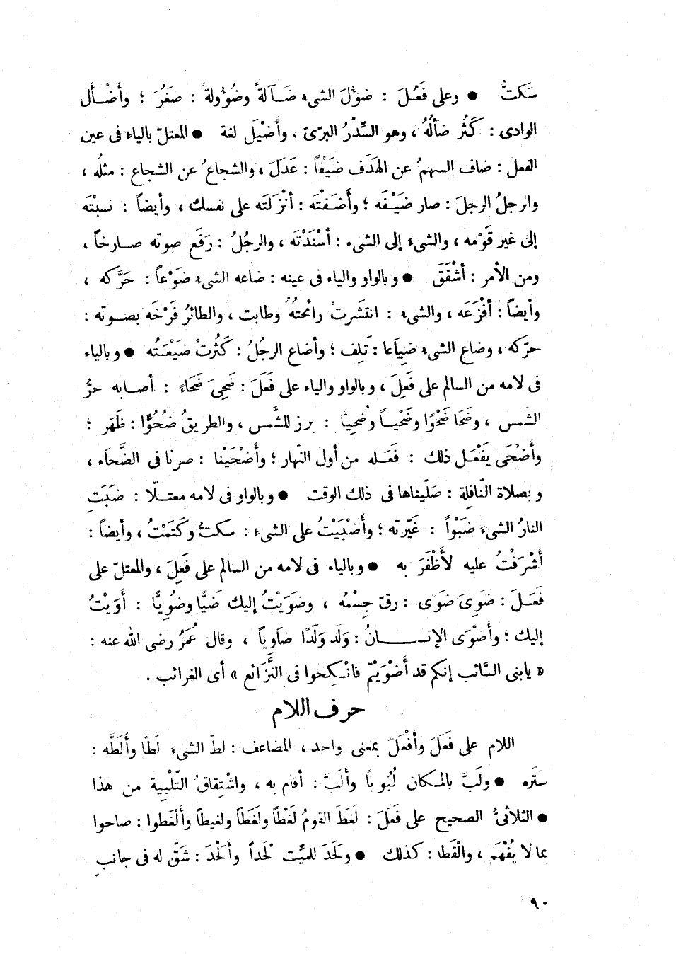 • المعتل بالياء في عين الفعل: ضاف السهم عن الهدف ضيفاً: عدل، والشجاع عن الشجاع: مثله، والرجل الرجل: صار ضيفه؛ وأضفته: أنزلته على نفسك، وأيضاً: نسبته إلى غير قومه، والشيء إلى الشيء: أسندته، والرجل: رفع صوته صارخاً، ومن الأمر: أشفق