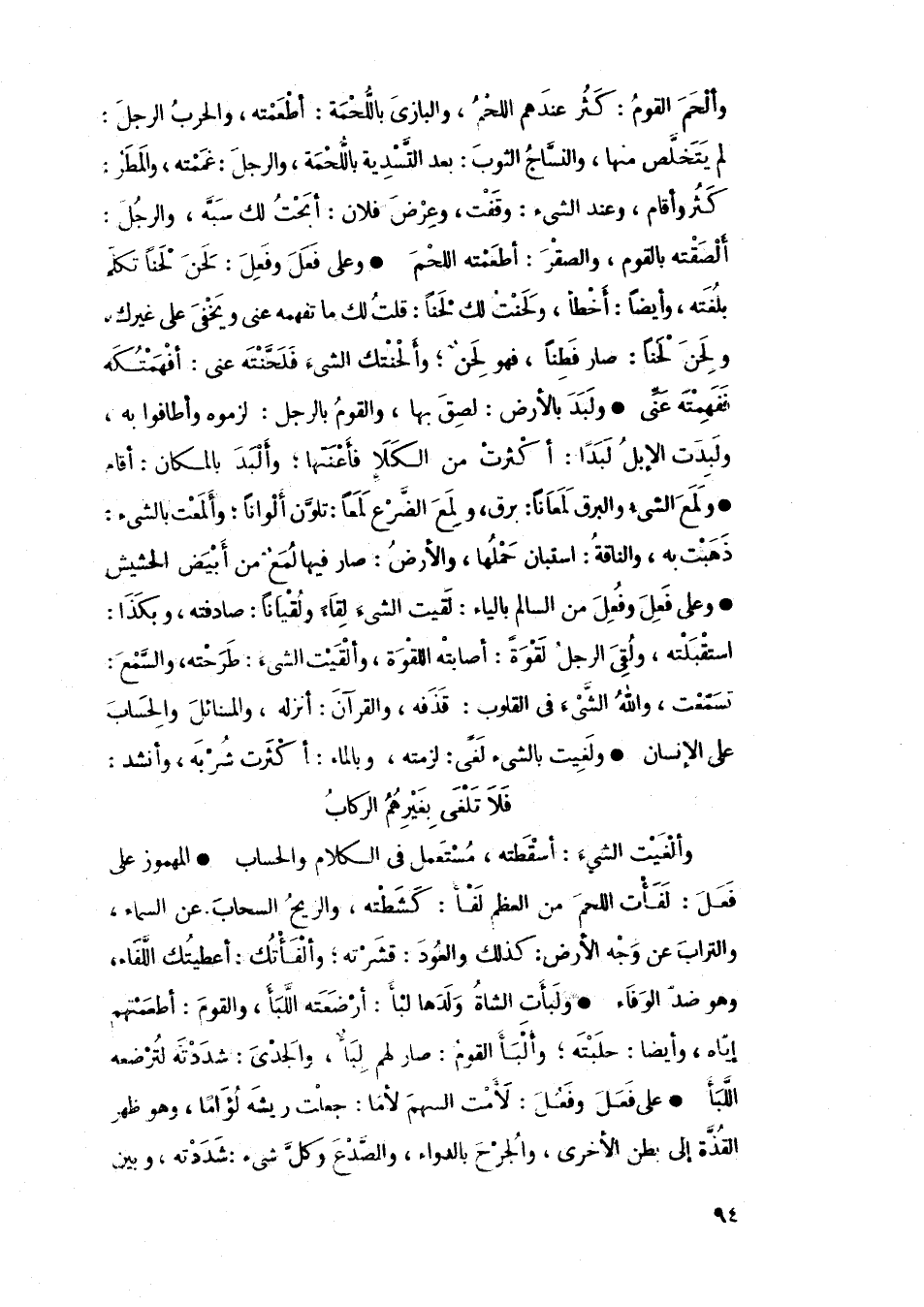 وألحم القوم: كثر عندهم اللحم، والبازي باللحمة: أطعمته، والحرب الرجل: لم يتخلص منها، والنساج الثوب: بعد التسدية باللحمة، والرجل: غممته، والمطر: كثر وأقام، وعند الشيء: وقفت، وعرض فلان: أبحت لك سبه، والرجل: ألصقته بالقوم، والصقر: أطعمته اللحم