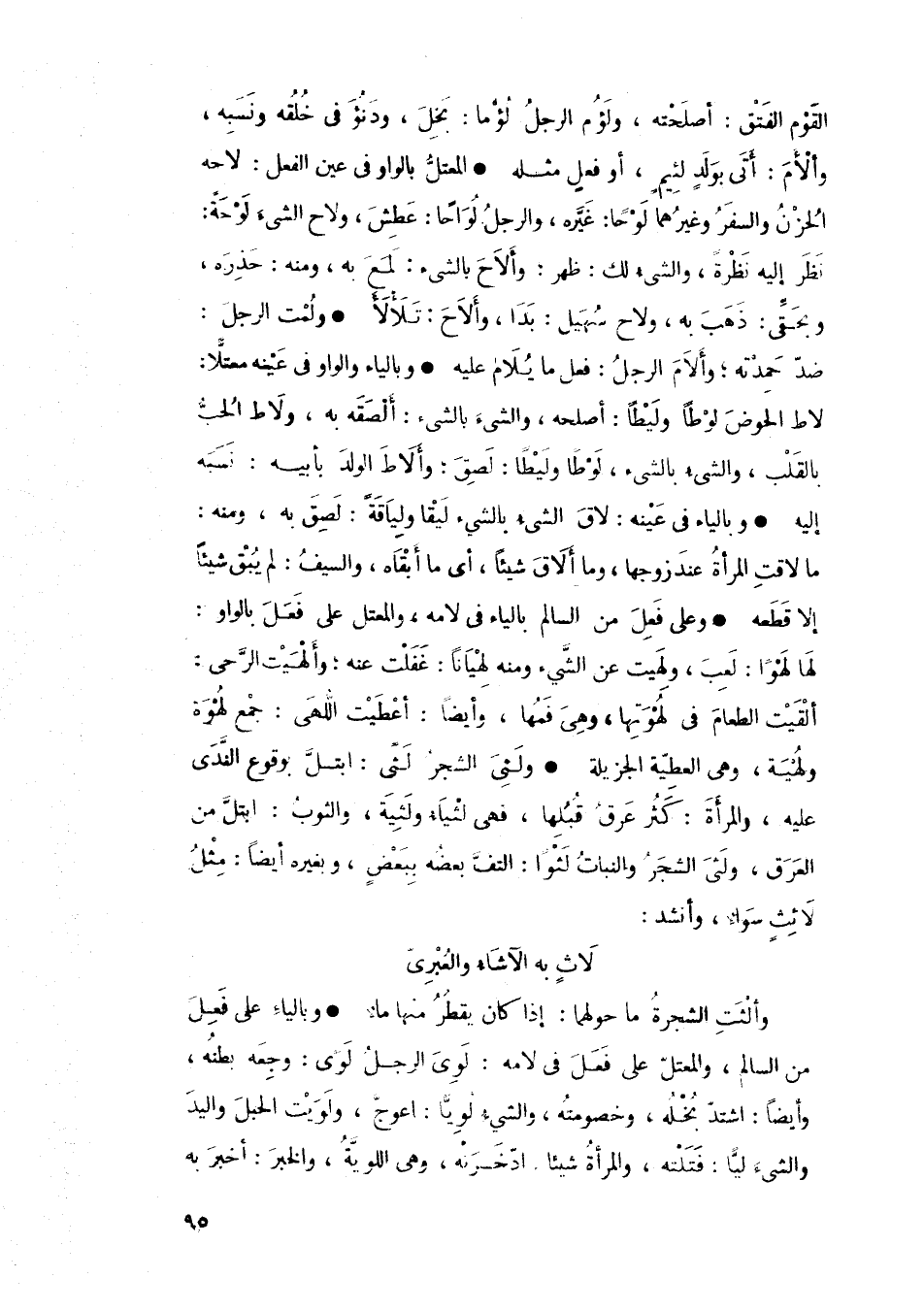 • وبالياء على فَعِلَ من السالم، والمعتل على فَعَلَ في لامه: لَويَ الرجل لَوَى: وجِعَه بطنه، وأيضاً: اشتد بخله، وخصومته، والشيء لوياً: اعوج، ولويت الحبل واليد والشيء لياً: فتلته، والمرأة شيئاً. ادخرته، وهي اللوية، والخبر: أخبر به