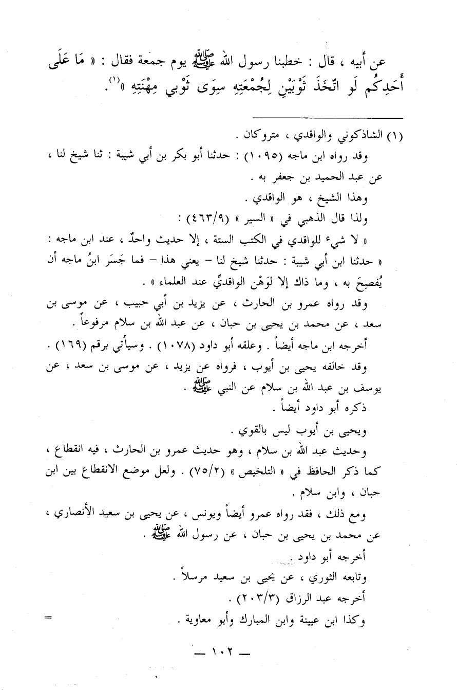 عَنْ أَبِيهِ، قَالَ: خَطَبَنَا رَسُولُ اللَّهِ صَلَّى اللَّهُ عَلَيْهِ وَسَلَّمَ يَوْمَ جُمُعَةٍ، فَقَالَ:"مَا عَلَى أَحَدِكُمْ لَوِ اتَّخذَ ثَوْبَيْنِ لِجُمُعَتِهِ سِوَى ثَوْبَيْ مِهْنَتِهِ".@