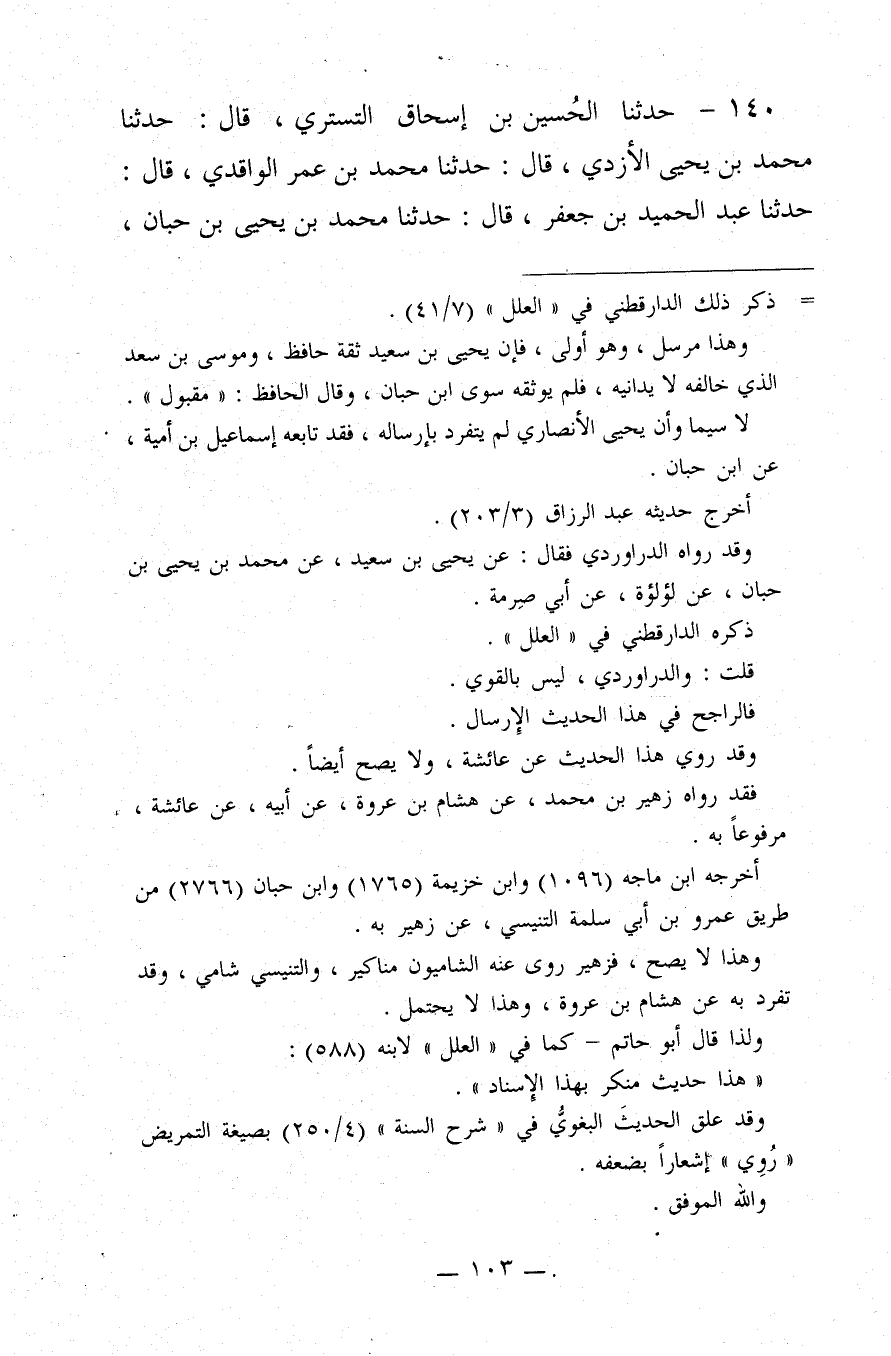 140 - حَدَّثَنَا الْحُسَيْنُ بن إِسْحَاقَ التُّسْتَرِيُّ، قَالَ: حَدَّثَنَا مُحَمَّدُ بن يَحْيَى الأَزْدِيُّ، قَالَ: حَدَّثَنَا مُحَمَّدُ بن عُمَرَ الْوَاقِدِيُّ، قَالَ: حَدَّثَنَا عَبْدُ الْحَمِيدِ بن جَعْفَرٍ، قَالَ: حَدَّثَنَا مُحَمَّدُ بن يَحْيَى بن حِبَّانَ،@