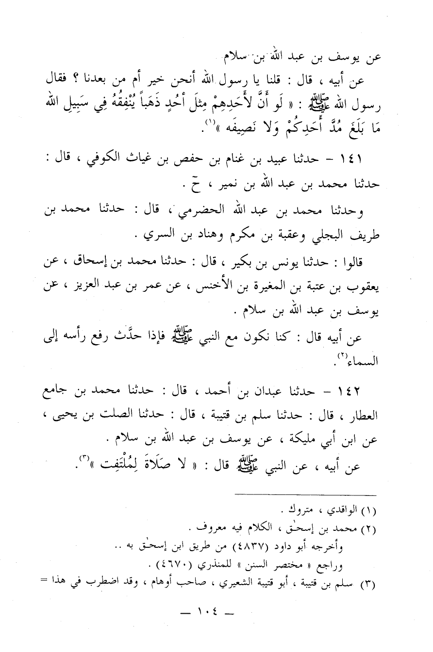 141 - حَدَّثَنَا عُبَيْدُ بن غَنَّامِ بن حَفْصِ بن غِيَاثٍ الْكُوفِيُّ، قَالَ: حَدَّثَنَا مُحَمَّدُ بن عَبْدِ اللَّهِ بن نُمَيْرٍ. ح وَحَدَّثَنَا مُحَمَّدُ بن عَبْدِ اللَّهِ الْحَضْرَمِيُّ، قَالَ: حَدَّثَنَا مُحَمَّدُ بن طَرِيفٍ الْبَجْلِيُّ، وَعُقْبَةُ بن مُكْرِمٌ، وَهَنَّادُ بن السَّرِيِّ، قَالُوا: حَدَّثَنَا يُونُسُ بن بُكَيْرٍ، قَالَ: حَدَّثَنَا مُحَمَّدُ بن إِسْحَاقَ، عَنْ يَعْقُوبَ بن عُتْبَةَ بن الْمُغِيرَةِ بن الأَخْنَسِ، عَنْ عُمَرَ بن عَبْدِ الْعَزِيزِ، عَنْ يُوسُفَ بن عَبْدِ اللَّهِ بن سَلامٍ، عَنْ أَبِيهِ، قَالَ:"كُنَّا نَكُونُ مَعَ النَّبِيِّ صَلَّى اللَّهُ عَلَيْهِ وَسَلَّمَ، فَإِذَا حَدَّثَ رَفَعَ رَأْسَهُ إِلَى السَّمَاءِ".