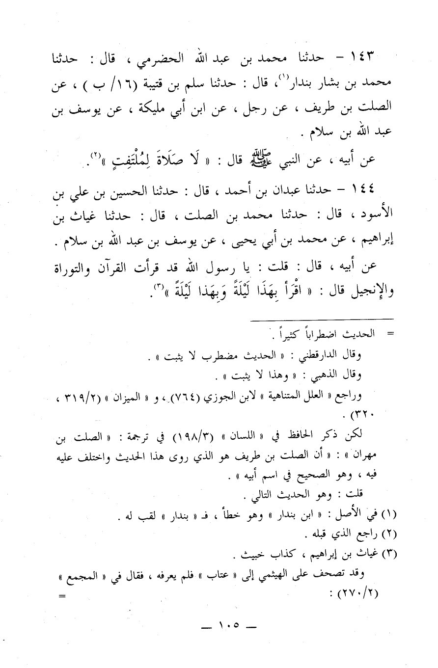 143 - حَدَّثَنَا مُحَمَّدُ بن عَبْدِ اللَّهِ الْحَضْرَمِيُّ، قَالَ: حَدَّثَنَا مُحَمَّدُ بن بَشَّارٍ بندَارٌ، قَالَ: حَدَّثَنَا سَلْمُ بن قُتَيْبَةَ، عَنِ الصَّلْتِ بن طَرِيفٍ، عَنْ رَجُلٍ، عَنِ ابْنِ أَبِي مُلَيْكَةَ، عَنْ يُوسُفَ بن عَبْدِ اللَّهِ بن سَلامٍ، عَنْ أَبِيهِ، عَنِ النَّبِيِّ صَلَّى اللَّهُ عَلَيْهِ وَسَلَّمَ، قَالَ:"لا صَلاةَ لِمُلْتَفِتٍ".