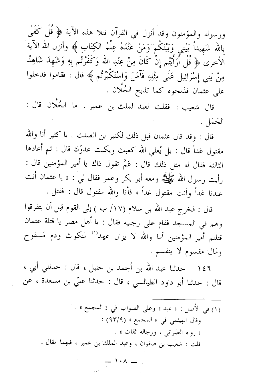 وَرَسُولُهُ، وَالْمُؤْمِنُونَ، وَقَدْ أُنْزِلَ فِيَّ الْقُرْآنُ، فَتَلا هَذِهِ الآيَةَ: ?قُلْ كَفَى بِاللَّهِ شَهِيدًا بَيْنِي وَبَيْنَكُمْ وَمَنْ عِندَهُ عِلْمُ الْكِتَابِ?[الرعد آية 43]، وَأَنْزَلَ اللَّهُ الآيَةَ الأُخْرَى: ?قُلْ أَرَأَيْتُمْ إِنْ كَانَ مِنْ عِنْدِ اللَّهِ وَكَفَرْتُمْ بِهِ وَشَهِدَ شَاهِدٌ مِنْ بني إِسْرَائِيلَ عَلَى مِثْلِهِ فَآمَنَ وَاسْتَكْبَرْتُمْ?[الأحقاف آية 10]، قَالَ: فَقَامُوا، فَدَخَلُوا عَلَى عُثْمَانَ، فَذَبَحُوهُ كَمَا تُذْبَحُ الْحُلانُ". قَالَ شُعَيْبٌ: فَقُلْتُ لِعَبْدِ الْمَلِكِ بن عُمَيْرٍ: مَا الْحُلانُ؟ قَالَ: الْحَمَلُ. قَالَ: وَقَدْ قَالَ عُثْمَانُ قَبْلَ ذَلِكَ لِكَثِيرِ بن الصَّلْتِ: يَا كَثِيرُ، أَنَا وَاللَّهِ مَقْتُولٌ غَدًا، قَالَ: بَلْ يُعْلِي اللَّهُ كَعْبَكَ، وَيَكْبِتُ عَدُوَّكَ، قَالَ: ثُمَّ أَعَادَهَا الثَّالِثَةَ، فَقَالَ لَهُ مِثْلَ ذَلِكَ، قَالَ: عَمَّ تَقُولُ ذَاكَ يَا أَمِيرَ الْمُؤْمِنِينَ، قَالَ: رَأَيْتُ رَسُولَ اللَّهِ صَلَّى اللَّهُ عَلَيْهِ وَسَلَّمَ، وَمَعَهُ أَبُو بَكْرٍ، وَعُمَرُ، فَقَالَ لِي:"يَا عُثْمَانُ، أَنْتَ عِنْدَنَا غَدًا، وَأَنْتَ مَقْتُولٌ غَدًا". فَأَنَا وَاللَّهِ مَقْتُولٌ، قَالَ: فَقُتِلَ. قَالَ: فَخَرَجَ عَبْدُ اللَّهِ بن سَلامٍ إِلَى الْقَوْمِ قَبْلَ أَنْ يَتَفَرَّقُوا، وَهُمْ فِي الْمَسْجِدِ، فَقَامَ عَلَى رِجْلَيْهِ، فَقَالَ: يَا أَهْلَ مِصْرَ، يَا قَتَلَةَ عُثْمَانَ، قَتَلْتُمْ أَمِيرَ الْمُؤْمِنِينَ، أَمَا وَاللَّهِ لا يَزَالُ عَهْدٌ مَنْكُوثٌ، وَدَمٌ مَسْفُوحٌ، وَمَالٌ مَقْسُومٌ لا يَنْقَسِمُ.