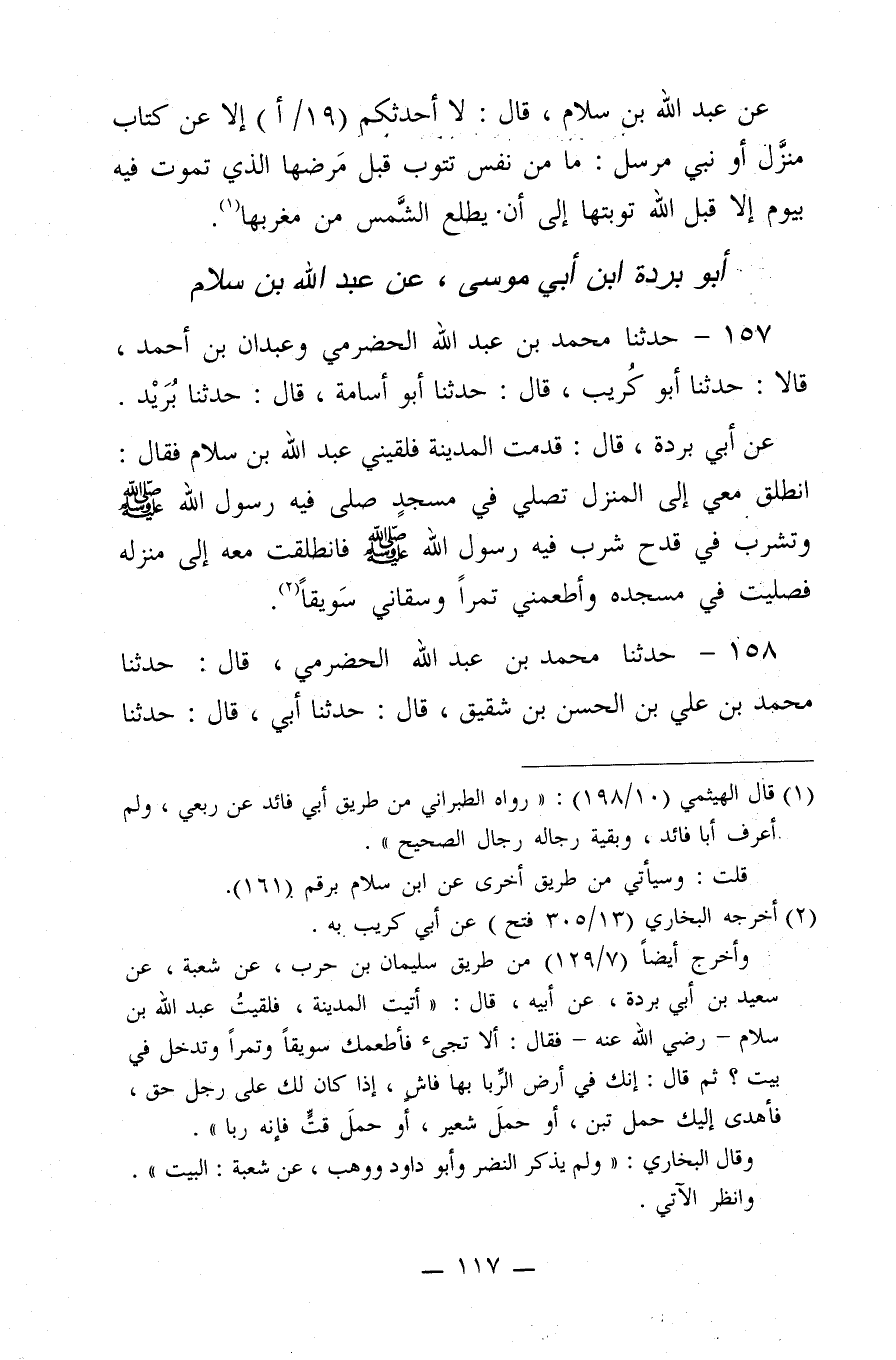 157 - حَدَّثَنَا مُحَمَّدُ بن عَبْدِ اللَّهِ الْحَضْرَمِيُّ، وَعَبْدَانُ بن أَحْمَدَ، قَالا: حَدَّثَنَا أَبُو كُرَيْبٍ، قَالَ: حَدَّثَنَا أَبُو أُسَامَةَ، قَالَ: حَدَّثَنَا بُرَيْدُ، عَنْ أَبِي بُرْدَةَ، قَالَ: قَدِمْتُ الْمَدِينَةَ، فَلَقِيَنِي عَبْدُ اللَّهِ بن سَلامٍ، فَقَالَ:"انْطَلِقْ مَعِي إِلَى الْمَنْزِلِ تُصَلِّي فِي مَسْجِدٍ صَلَّى فِيهِ رَسُولُ اللَّهِ صَلَّى اللَّهُ عَلَيْهِ وَسَلَّمَ، وَتَشْرَبُ فِي قَدَحٍ شَرِبَ فِيهِ رَسُولُ اللَّهِ صَلَّى اللَّهُ عَلَيْهِ وَسَلَّمَ، فَانْطَلَقْتُ مَعَهُ إِلَى مَنْزِلِهِ، فَصَلَّيْتُ فِي مَسْجِدِهِ، وَأَطْعَمَنِي تَمْرًا، وَسَقَانِي سُويْقًا".