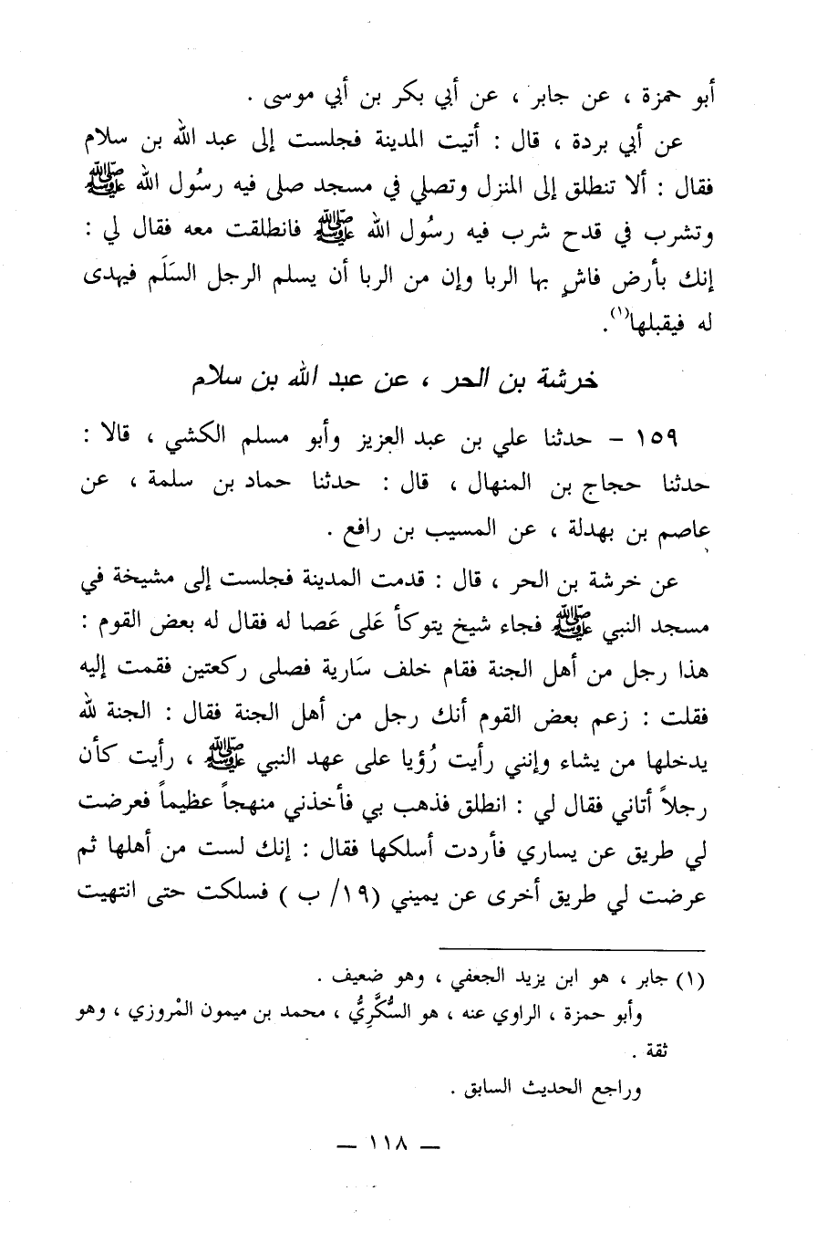 159 - حَدَّثَنَا عَلِيُّ بن عَبْدِ الْعَزِيزِ، وُأَبُو مُسْلِمٍ الْكَشِّيُّ، قَالا، حَدَّثَنَا حَجَّاجُ بن الْمِنْهَالِ، قَالَ: حَدَّثَنَا حَمَّادُ بن سَلَمَةَ، عَنْ عَاصِمِ بن بَهْدَلَةَ، عَنِ الْمُسَّيِّبِ بن رَافِعٍ، عَنْ خَرَشَةَ بن الْحُرِّ، قَالَ: قَدِمْتُ الْمَدِينَةَ، فَجَلَسْتُ إِلَى مَشْيَخَةٍ فِي مَسْجِدِ النَّبِيِّ صَلَّى اللَّهُ عَلَيْهِ وَسَلَّمَ، فَجَاءَ شَيْخٌ يَتَوَكَّأُ عَلَى عَصًا لَهُ، فَقَالَ لَهُ بَعْضُ الْقَوْمِ: هَذَا رَجُلٌ مِنْ أَهْلَ الْجَنَّةِ، فَقَامَ خَلْفَ سَارِيَةٍ فَصَلَّى رَكْعَتَيْنِ، فَقُمْتُ إِلَيْهِ، فَقُلْتُ:"زَعَمَ بَعْضُ الْقَوْمِ أَنَّكَ رَجُلٌ مِنْ أَهْلِ الْجَنَّةِ، فَقَالَ: الْجَنَّةُ لِلَّهِ، يُدْخِلُهَا مَنْ يَشَاءُ، وَإِنَّنِي رَأَيْتُ رُؤْيَا عَلَى عَهْدِ النَّبِيِّ صَلَّى اللَّهُ عَلَيْهِ وَسَلَّمَ، رَأَيْتُ كَأَنَّ رَجُلا أَتَانِي، فَقَالَ لِي: انْطَلِقْ، فَذَهَبَ بِي، فَأَخَذَنِي مَنْهَجًا عَظِيمًا، فَعَرَضَتْ لِي طَرِيقٌ عَنْ يَسَارِي، فَأَرَدْتُ أَسُلُكَها، فَقَالَ: إِنَّكَ لَسْتَ مِنْ أَهْلِهَا، ثُمَّ عَرَضَتْ لِي طَرِيقٌ أُخْرَى عَنْ يَمِينِي فَسَلَكْتُ، حَتَّى انْتَهَيْتُ @