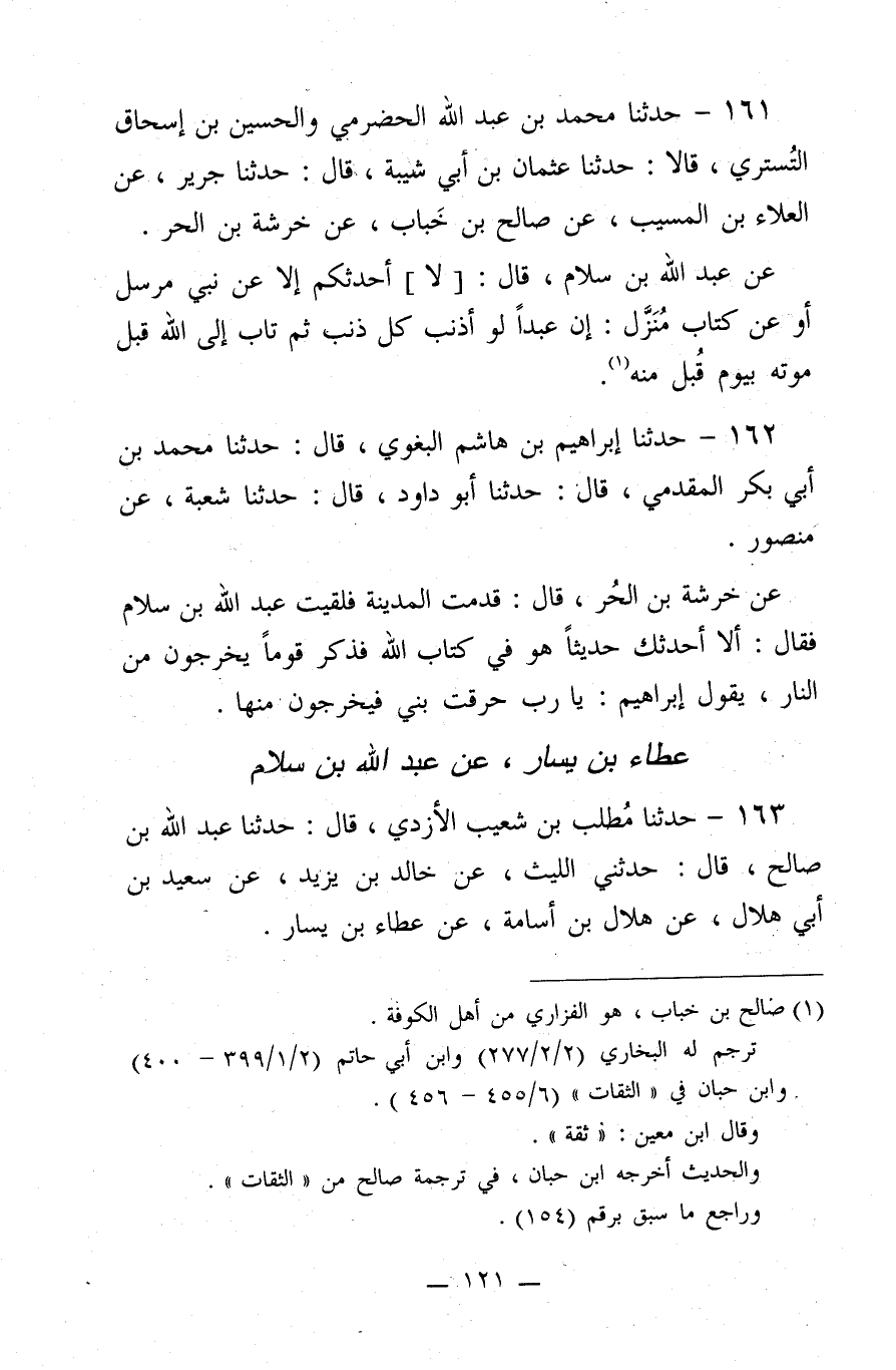 - 161 - حَدَّثَنَا مُحَمَّدُ بن عَبْدِ اللَّهِ الْحَضْرَمِيُّ، وَالْحُسَيْنُ بن إِسْحَاقَ التُّسْتَرِيُّ، قَالا: حَدَّثَنَا عُثْمَانُ بن أَبِي شَيْبَةَ، قَالَ: حَدَّثَنَا جَرِيرٌ، عَنِ الْعَلاءِ بن الْمُسَيِّبِ، عَنْ صَالِحِ بن خَبَّابٍ، عَنْ خَرَشَةَ بن الْحُرِّ، عَنْ عَبْدِ اللَّهِ بن سَلامٍ، قَالَ:"لا أُحَدِّثُكُمْ إِلا عَنْ نَبِيٍّ مُرْسَلٍ، أَوْ عَنْ كِتَابٍ مُنَزَّلٍ: إِنَّ عَبْدًا لَوْ أَذْنَبَ كُلَّ ذَنْبٍ، ثُمَّ تَابَ إِلَى اللَّهِ قَبْلَ مَوْتِهِ بِيَوْمٍ قُبِلَ مِنْهُ".