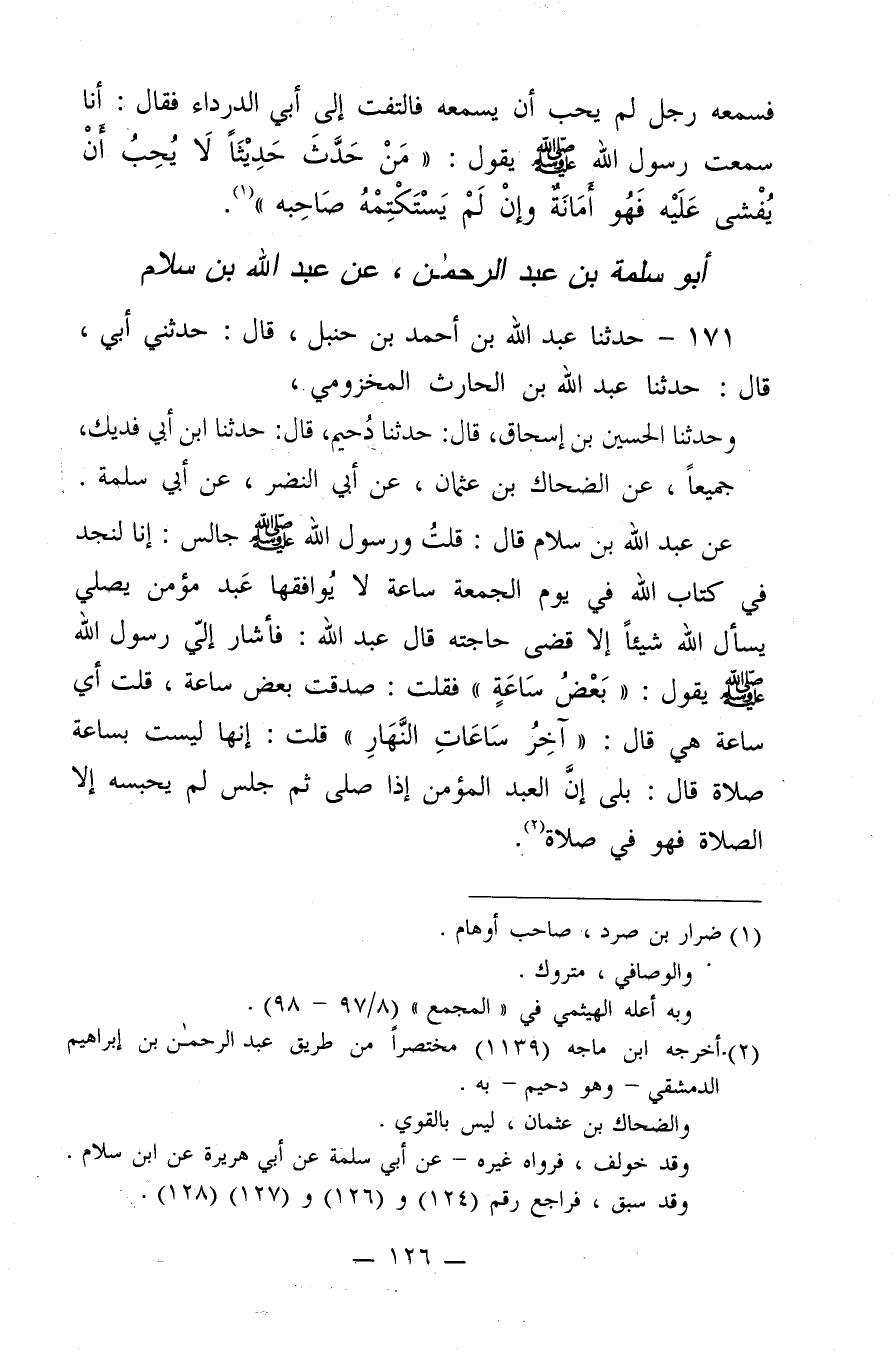 171 - حَدَّثَنَا عَبْدُ اللَّهِ بن أَحْمَدَ بن حَنْبَلٍ، قَالَ: حَدَّثَني أَبِي، قَالَ: حَدَّثَنَا عَبْدُ اللَّهِ بن الْحَارِثِ الْمَخْزُومِيُّ، وَحَدَّثَنَا الْحُسَيْنُ بن إِسْحَاقَ، قَالَ: حَدَّثَنَا دُحَيْمٌ، قَالَ: حَدَّثَنَا ابْنُ أَبِي فُدَيْكٍ جَمِيعًا، عَنِ الضَّحَّاكِ بن عُثْمَانَ، عَنْ أَبِي النَّضْرِ، عَنْ أَبِي سَلَمَةَ، عَنْ عَبْدِ اللَّهِ بن سَلامٍ، قَالَ: قُلْتُ وَرَسُولُ اللَّهِ صلى الله عليه وسلم جالس: إِنَّا لَنَجِدُ فِي كِتَابِ اللَّهِ فِي يَوْمِ الْجُمُعَةِ سَاعَةً لا يُوَافِقُهَا عَبْدٌ مُؤْمِنٌ يُصَلِّي يَسْأَلُ اللَّهَ شَيْئًا، إِلا قَضَى حَاجَتَهُ، قَالَ عَبْدُ اللَّهِ: فَأَشَارَ إِلَيَّ رَسُولُ اللَّهِ صَلَّى اللَّهُ عَلَيْهِ وَسَلَّمَ، يَقُولُ:"بَعْضُ سَاعَةٍ". فقُلْتُ: صَدَقْتَ، بَعْضُ سَاعَةٍ، قُلْتُ: أَيُّ سَاعَةٍ هِيَ؟ قَالَ:"آخِرُ سَاعَاتِ النَّهَارِ". قُلْتُ: إِنَّهَا لَيْسَتْ بِسَاعَةِ صَلاةٍ، قَالَ:"بَلْ، إِنَّ الْعَبْدَ الْمُؤْمِنَ إِذَا صَلَّى، ثُمَّ جَلَسَ لَمْ يَحْبِسْهُ إِلا الصَّلاةُ، فَهُوَ فِي صَلاةٍ".@