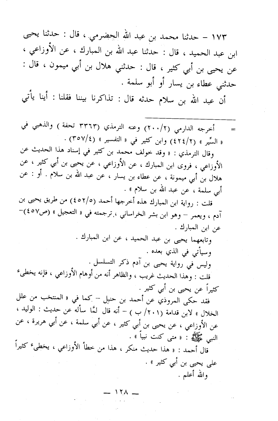 173 - حَدَّثَنَا ابْنُ مُحَمَّدِ بن عَبْدِ اللَّهِ الْحَضْرَمِيُّ، قَالَ: حَدَّثَنَا يَحْيَى بن عَبْدِ الْحَمِيدِ، قَالَ: حَدَّثَنَا عَبْدُ اللَّهِ بن الْمُبَارَكِ، عَنِ الأَوْزَاعِيِّ، عَنْ يَحْيَى بن أَبِي كَثِيرٍ، قَالَ: حَدَّثَنِي هِلالُ بن أَبِي مَيْمُونٍ، قَالَ: حَدَّثَنِي عَطَاءُ بن يَسَارٍ، أَوْ أَبُو سَلَمَةَ، أَنَّ عَبْدَ اللَّهِ بن سَلامٍ حَدَّثَهُ، قَالَ: تَذَاكَرْنَا بَيْنَنَا، فَقُلْنَا:"أَيُّنَا يَأْتِي@