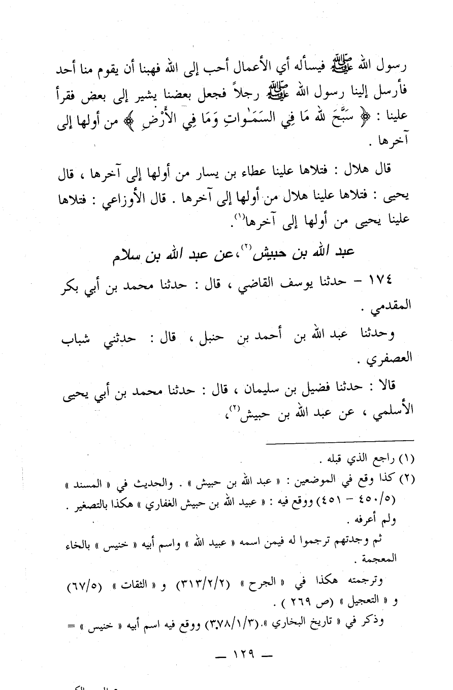 174 - حَدَّثَنَا يُوسُفُ الْقَاضِي، قَالَ: حَدَّثَنَا مُحَمَّدُ بن أَبِي بَكْرٍ الْمُقَدَّمِيُّ، وَحَدَّثَنَا عَبْدُ اللَّهِ بن أَحْمَدَ بن حَنْبَلٍ، قَالَ: حَدَّثَنِي شَبَابٌ الْعُصْفُرِيُّ، قَالا: حَدَّثَنَا فُضَيْلُ بن سُلَيْمَانَ، قَالَ: حَدَّثَنَا مُحَمَّدُ بن أَبِي يَحْيَى الأَسْلَمِيُّ، عَنْ عَبْدِ اللَّهِ بن حُبَيْشٍ،@