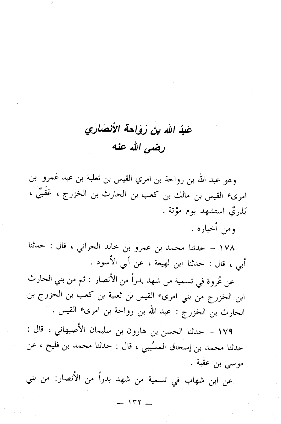 178 - حَدَّثَنَا مُحَمَّدُ بن عَمْرِو بن خَالِدٍ الْحَرَّانِيُّ، قَالَ: حَدَّثَنَا أَبِي، قَالَ: حَدَّثَنَا ابْنُ لَهِيعَةَ، عَنْ أَبِي الأَسْوَدِ، عَنْ عُرْوَةَ،"فِي تَسْمِيَةِ مَنْ شَهِدَ بَدْرًا مِنَ الأَنْصَارِ، ثُمَّ مِنْ بني الْحَارِثِ ابْنِ الْخَزْرَجِ مِنْ بني امْرِئِ الْقَيْسِ بن ثَعْلَبَةَ بن كَعْبِ بن الْخَزْرَجِ بن الْحَارِثِ بن الْخَزْرَجِ: عَبْدُ اللَّهِ بن رَوَاحَةَ بن امْرِئِ الْقَيْسِ".