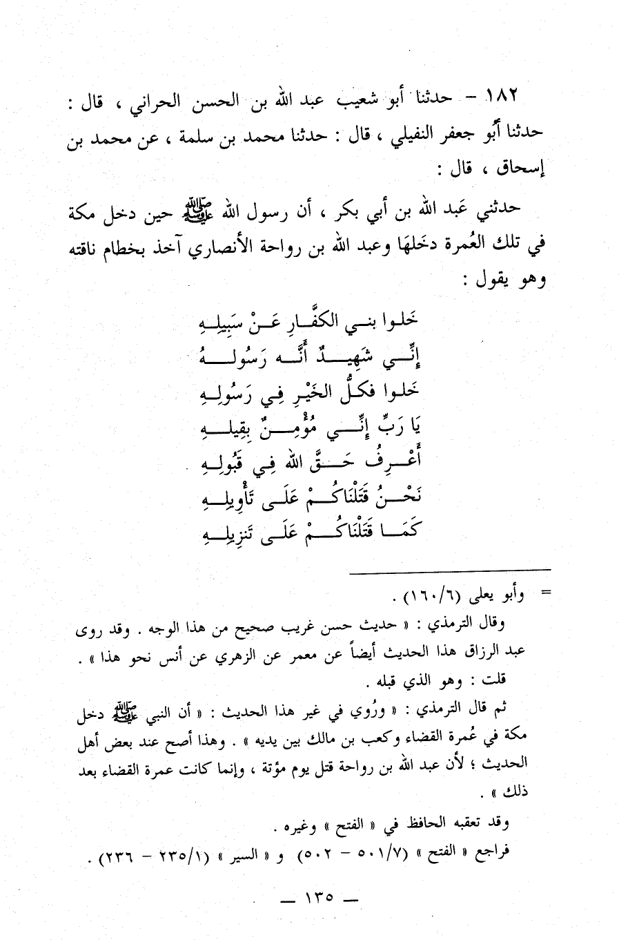 182 - حَدَّثَنَا أَبُو شُعَيْبٍ عَبْدُ اللَّهِ بن الْحَسَنِ الَحَرَّانِيُّ، قَالَ: حَدَّثَنَا أَبُو جَعْفَرٍ النُّفَيْلِيُّ، قَالَ: حَدَّثَنَا مُحَمَّدُ بن سَلَمَةَ، عَنْ مُحَمَّدِ بن إِسْحَاقَ، قَالَ: حَدَّثَنِي عَبْدُ اللَّهِ بن أَبِي بَكْرٍ،"أَنَّ رَسُولَ اللَّهِ صَلَّى اللَّهُ عَلَيْهِ وَسَلَّمَ حِينَ دَخَلَ مَكَّةَ فِي تِلْكَ الْعُمْرَةِ، دَخَلَهَا وَعَبْدُ اللَّهِ بن رَوَاحَةَ الأَنْصَارِيُّ آخَذٌ بِخِطَامِ نَاقَتِهِ، وَهُوَ يَقُولُ:
