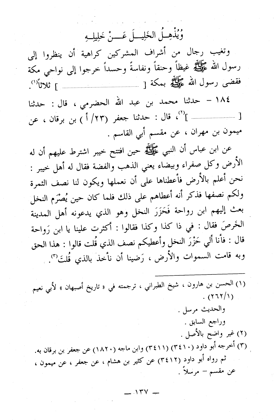 184 - حَدَّثَنَا مُحَمَّدُ بن عَبْدِ اللَّهِ الْحَضْرَمِيُّ، قَالَ: حَدَّثَنَا............، قَالَ: حَدَّثَنَا جَعْفَرُ بن بَرْقَانَ، عَنْ مَيْمُونِ بن مَهْرَانَ، عَنْ مُقْسِمٍ أَبِي الْقَاسِمِ، عَنِ ابْنِ عَبَّاسٍ،"أَنَّ النَّبِيَّ صَلَّى اللَّهُ عَلَيْهِ وَسَلَّمَ حِينَ افْتَتَحَ خَيْبَرَ، اشْتَرَطَ عَلَيْهِمْ أَنَّ لَهُ الأَرْضَ وَكُلَّ صَفْرَاءَ، وَبَيْضَاءَ، يَعْنِي الذَّهَبَ وَالْفِضَّةَ، فَقَالَ لَهُ أَهْلُ خَيْبَرَ: نَحْنُ أَعْلَمُ بِالأَرْضِ، فَأَعْطِنَاهَا عَلَى أَنْ نُعْلِمَهَا، وَيَكُونَ لَنَا نِصْفُ الثَّمَرَةِ، وَلَكُمْ نِصْفُهَا، فَذَكَرَ أَنَّهُ أَعْطَاهُمْ عَلَى ذَلِكَ، فَلَمَّا كَانَ حِينَ يُصْرَمُ النَّخْلُ، بَعَثَ إِلَيْهِمُ ابْنَ رَوَاحَةَ، فَحَرَزَ النَّخْلَ، وَهُوَ الَّذِي يَدْعُونَهُ أَهْلُ الْمَدِينَةِ الْخَرَصَ، فَقَالَ: فِي ذَا كَذَا وَكَذا، فَقَالُوا: أَكْثَرْتَ عَلَيْنَا يَا ابْنَ رَوَاحَةَ، قَالَ: فَأَنَا أَلِي حِرْزَ النَّخْلِ، وَأُعْطِيكُمْ نِصْفَ الَّذِي قُلْتَ، قَالُوا: هَذَا الْحَقُّ، وَبِهِ قَامَتِ السَّمَوَاتُ وَالأَرْضُ، رَضِينَا أَنْ نَأْخُذَ بِالَّذِي قُلْتَ.@