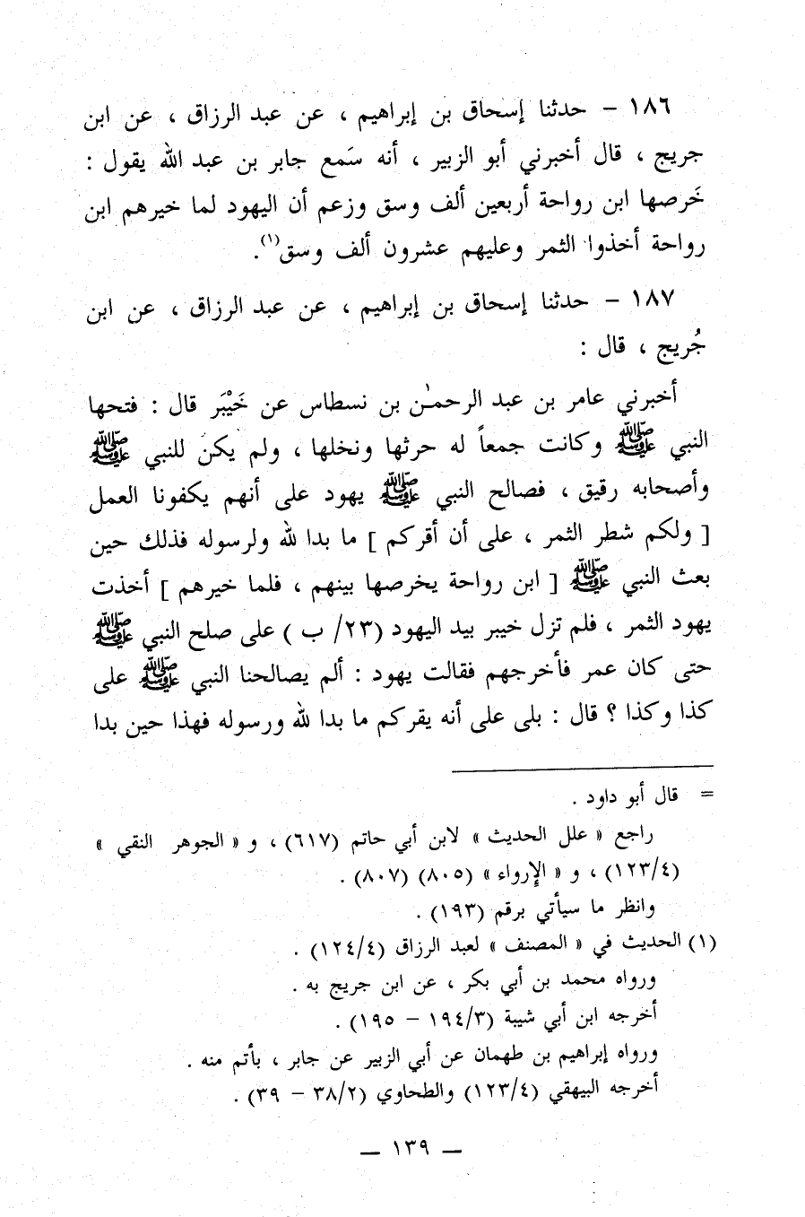 186 - حَدَّثَنَا إِسْحَاقُ بن إِبْرَاهِيمَ، عَنْ عَبْدِ الرَّزَّاقِ، عَنِ ابْنِ جُرَيْجٍ، قَالَ: أَخْبَرَنِي أَبُو الزُّبَيْرِ، أَنَّهُ سَمِعَ جَابِرَ بن عَبْدِ اللَّهِ، يَقُولُ:"خَرَصَهَا ابْنُ رَوَاحَةَ أَرْبَعِينَ أَلْفَ وَسَقٍ، وَزَعَمَ أَنَّ الْيَهُودَ لَمَّا خَيَّرَهُمُ ابْنُ رَوَاحَةَ، أَخَذُوُا الثَّمَرَ وَعَلَيْهِمْ عُشْرُونَ أَلَفَ وَسَقٍ".