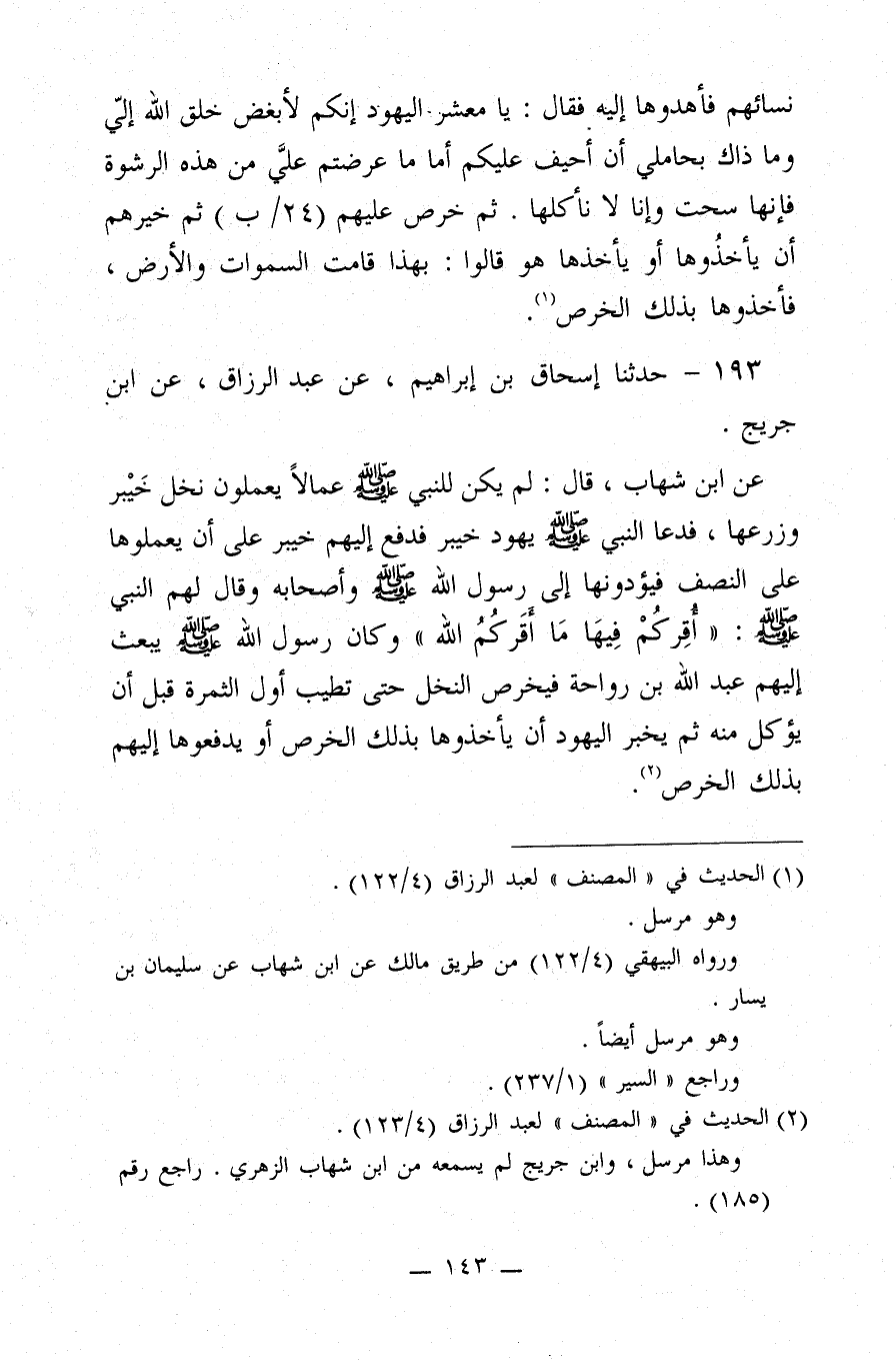 193 - حَدَّثَنَا إِسْحَاقُ بن إِبْرَاهِيمَ، عَنْ عَبْدِ الرَّزَّاقِ، عَنِ ابْنِ جُرَيْجٍ، عَنِ ابْنِ شِهَابٍ، قَالَ: لَمْ يَكُنْ لِلنَّبِيِّ صَلَّى اللَّهُ عَلَيْهِ وَسَلَّمَ عُمَّالا يَعْمَلُونَ نَخْلَ خَيْبَرَ وَزَرْعَهَا، فَدَعَا النَّبِيُّ صَلَّى اللَّهُ عَلَيْهِ وَسَلَّمَ يَهُودَ خَيْبَرَ، فَدَفَعَ إِلَيْهِمْ خَيْبَرَ، عَلَى أَنْ يَعْمَلُوهَا عَلَى النِّصْفِ، فَيُؤَدُّونَهَا إِلَى رَسُولِ اللَّهِ صَلَّى اللَّهُ عَلَيْهِ وَسَلَّمَ، وَأَصْحَابِهِ، وَقَالَ لَهُمُ النَّبِيُّ صَلَّى اللَّهُ عَلَيْهِ وَسَلَّمَ:"أُقِرُّكُمْ فِيهَا مَا أَقَرَّكُمُ اللَّهُ". وَكَانَ رَسُولُ اللَّهِ صَلَّى اللَّهُ عَلَيْهِ وَسَلَّمَ يَبْعَثُ إِلَيْهِمْ عَبْدَ اللَّهِ بن رَوَاحَةَ، فَيَخْرِصُ النَّخْلَ، حَتَّى تَطِيبَ أَوَّلَ الثَّمَرَةِ قَبْلَ أَنْ يُؤْكَلَ مِنْهُ، ثُمَّ يُخْبِرُ الْيَهُودَ أَنْ يَأْخُذُوهَا بِذَلِكَ الْخَرَصِ، أَوْ يَدْفَعُوهَا إِلَيْهِمْ بِذَلِكَ الْخَرَصِ".@