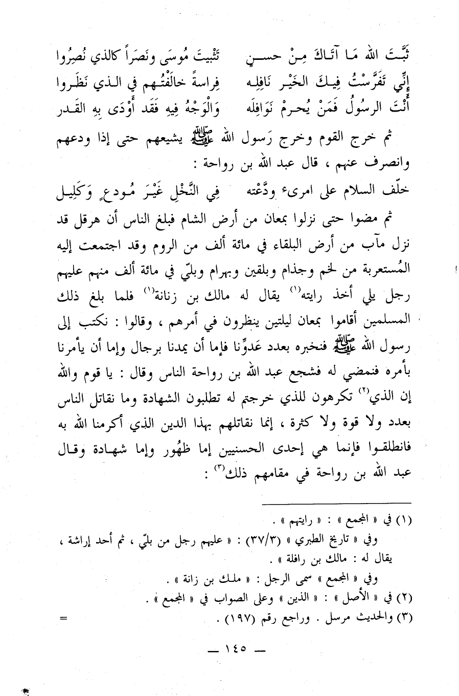 ثُمَّ مَضُوا، حَتَّى نَزَلُوا بِمَعَانَ مِنْ أَرْضِ الشَّامِ، فَبَلَغَ النَّاسَ أَنَّ هِرَقْلَ قَدْ نَزَلَ مَآبَ مِنْ أَرْضِ الْبَلْقَاءِ فِي مَائَةِ أَلْفٍ مِنَ الرُّومِ، وَقَدِ اجْتَمَعَتْ إِلَيْهِ الْمُسْتَعْرِبَةُ مِنْ لَخْمٍ، وَجُذَامٍ، وَبَلْقَينَ، وَبَهْرَامٍ، وَبَلِيٍّ فِي مَائَةِ أَلْفٍ مِنْهُمْ عَلَيْهِمْ رَجُلٌ يَلِي أَخْذَ رَايَتِهِ، يُقَالَ لَهُ: مَالِكُ بنزِنَانَةَ، فَلَمَّا بَلَغَ ذَلِكَ الْمُسْلِمِينَ، أَقَامُوا بِمَعَانَ لَيْلَتَيْنِ يَنْظُرُونَ فِي أَمْرِهِمْ، وَقَالُوا: نَكْتُبُ إِلَى رَسُولِ اللَّهِ صَلَّى اللَّهُ عَلَيْهِ وَسَلَّمَ، فَنُخْبِرُهُ بِعَدِدِ عَدُوِّنَا، فَإِمَّا أَنْ يُمِدَّنَا بِرِجَالٍ، وَإِمَّا أَنْ يَأْمُرَنَا بِأَمْرِهِ فَنَمْضِي لَهُ، فَشَجَّعَ عَبْدُ اللَّهِ بن رَوَاحَةَ النَّاسَ، وَقَالَ: يَا قَوْمُ، وَاللَّهِ إِنَّ الَّذِي تَكْرَهُونَ لِلَّذِي خَرَجْتُمْ لَهُ تَطْلُبُونَ الشَّهَادَةَ، وَمَا نُقَاتِلُ النَّاسَ بِعَدَدٍ، وَلا قُوَّةٍ، وَلا كَثْرَةٍ، إِنَّمَا نُقَاتِلُهُمْ بِهَذَا الدِّينِ الَّذِي أَكْرَمَنَا اللَّهُ بِهِ، فَانْطَلِقُوا فَإِنَّمَا هِيَ إِحْدَى الْحُسْنَيَيْنِ، إِمَّا ظُهُورٌ، وَإِمَّا شَهَادَةٌ، وَقَالَ عَبْدُ اللَّهِ بن رَوَاحَةَ فِي مَقَامِهِمْ ذَلِكَ ).@