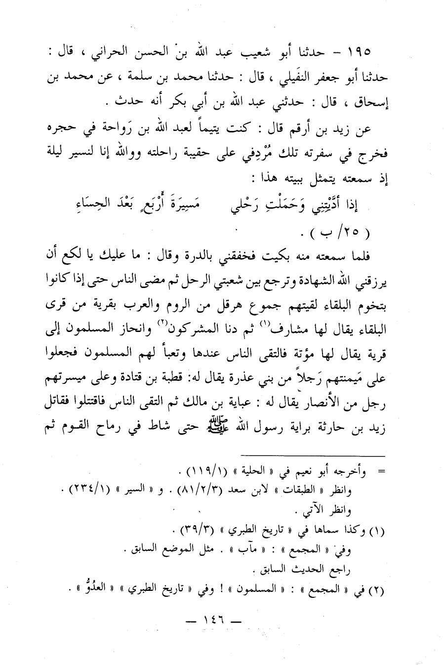 195 - حَدَّثَنَا أَبُو شُعَيْبٍ عَبْدُ اللَّهِ بن الْحَسَنِ الْحَرَّانِيُّ، قَالَ: حَدَّثَنَا أَبُو جَعْفَرٍ النُّفَيْلِيُّ، قَالَ: حَدَّثَنَا مُحَمَّدُ بن سَلَمَةَ، عَنْ مُحَمَّدِ بن إِسْحَاقَ، قَالَ: حَدَّثَنِي عَبْدُ اللَّهِ بن أَبِي بَكْرٍ، أَنَّهُ حَدَّثَ، عَنْ زَيْدِ بن أَرْقَمَ، قَالَ: كُنْتُ يَتِيمًا لِعَبْدِ اللَّهِ بن رَوَاحَةَ فِي حِجْرِهِ، فَخَرَجَ فِي سَفْرَتِهِ تِلْكَ مُرْدِفِي عَلَى حَقِيبَةِ رَاحِلَتِهِ، وَوَاللَّهِ إِنَّا لَنَسِيرُ لَيْلَةً، إِذْ سَمِعْتُهُ يَتَمَثَّلُ بِبَيْتِهِ هَذَا: