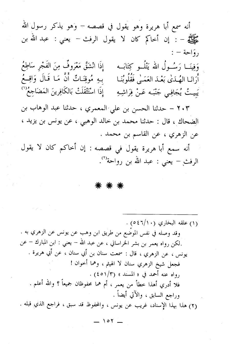 203 - حَدَّثَنَا الْحَسَنُ بن عَلِيٍّ الْمَعْمَرِيُّ، حَدَّثَنَا عَبْدُ الْوَهَّابِ بن الضّحَّاكِ، قَالَ: حَدَّثَنَا مُحَمَّدُ بن خَالِدٍ الْوَهْبِيُّ، عَنْ يُونُسَ بن يَزِيدَ، عَنِ الزُّهْرِيِّ، عَنِ الْقَاسِمِ بن مُحَمَّدٍ، أَنَّهُ سَمِعَ أَبَا هُرَيْرَةَ، يَقُولُ فِي قَصَصِهِ:"إِنَّ أَخَاكُمْ كَانَ لا يَقُولُ الرَّفَثَ". يَعْنِي: عَبْدُ اللَّهِ بن رَوَاحَةَ.@