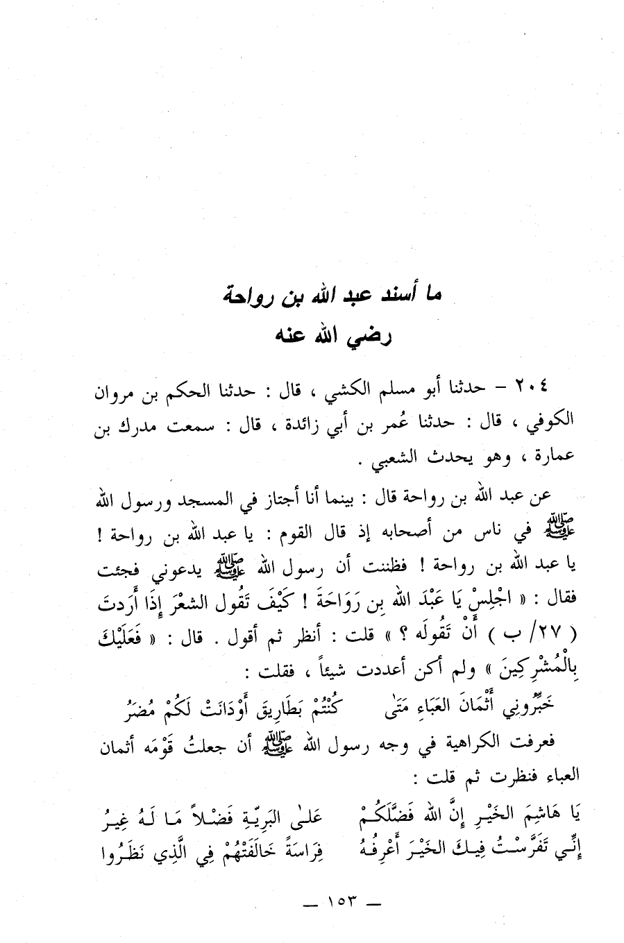 204 - حَدَّثَنَا أَبُو مُسْلِمٍ الْكَشِّيُّ، قَالَ: حَدَّثَنَا الْحَكَمُ بن مَرْوَانَ الْكُوفِيُّ، قَالَ: حَدَّثَنَا عُمَرُ بن أَبِي زَائِدَةَ، قَالَ: سَمِعْتُ مُدْرِكَ بن عِمَارَةَ وَهُوَ يُحَدِّثُ الشَّعْبِيَّ، عَنْ عَبْدِ اللَّهِ بن رَوَاحَةَ، قَالَ: بَيْنَمَا أَنَا أَجْتَازُ فِي الْمَسْجِدِ، وَرَسُولُ اللَّهِ صَلَّى اللَّهُ عَلَيْهِ وَسَلَّمَ فِي نَاسٍ مِنْ أَصْحَابِهِ، إِذْ قَالَ الْقَوْمُ: يَا عَبْدَ اللَّهِ بن رَوَاحَةَ، يَا عَبْدَ اللَّهِ بن رَوَاحَةَ، فَظَنَنْتُ أَنَّ رَسُولَ اللَّهِ صَلَّى اللَّهُ عَلَيْهِ وَسَلَّمَ يَدْعُونِي، فَجِئْتُ، فَقَالَ:"اجْلِسْ يَا عَبْدَ اللَّهِ بن رَوَاحَةَ، كَيْفَ تَقُولُ الشِّعْرَ إِذَا أَرَدْتَ أَنْ تَقُولَهُ؟"قُلْتُ: أَنْظُرُ، ثُمَّ أَقُولُ. قَالَ:"فَعَلَيْكَ بِالْمُشْرِكِينَ"، وَلَمْ أَكُنْ أَعْدَدْتُ شَيْئًا، فَقُلْتُ: