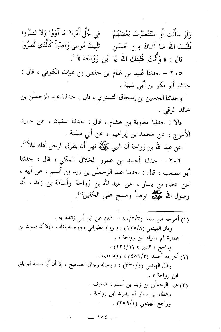 206 - حَدَّثَنَا أَحْمَدُ بن عَمْرٍو الْخَلالُ الْمَكِّيُّ، قَالَ: حَدَّثَنَا أَبُو مُصْعَبٍ، قَالَ: حَدَّثَنَا عَبْدُ الرَّحْمَنِ بن زَيْدِ بن أَسْلَمَ، عَنْ أَبِيهِ، عَنْ عَطَاءِ بن يَسَارٍ، عَنْ عَبْدِ اللَّهِ بن رَوَاحَةَ، وَأُسَامَةَ بن زَيْدٍ،"أن رَسُولَ اللَّهِ صَلَّى اللَّهُ عَلَيْهِ وَسَلَّمَ، تَوَضَّأَ وَمَسَحَ عَلَى الْخُفَّيْنِ".@