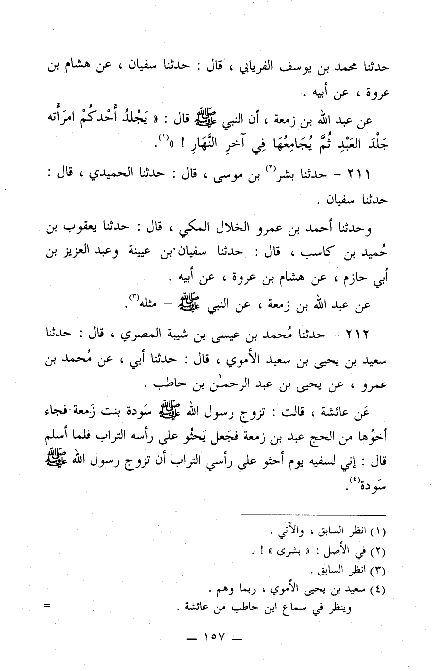 حَدَّثَنَا مُحَمَّدُ بن يُوسُفَ الْفِرْيَابِيُّ، قَالَ: حَدَّثَنَا سُفْيَانُ، عَنْ هِشَامِ بن عُرْوَةَ، عَنْ أَبِيهِ، عَنْ عَبْدِ اللَّهِ بن زَمْعَةَ، أَنّ النَّبِيَّ صَلَّى اللَّهُ عَلَيْهِ وَسَلَّمَ، قَالَ:"يَجْلِدُ أَحَدُكُمُ امْرَأَتَهُ جَلْدَ الْعَبْدِ، ثُمَّ يُجَامِعُهَا فِي آخِرِ النَّهَارِ !". حَدَّثَنَا بِشْرُ بن مُوسَى، قَالَ: حَدَّثَنَا الْحُمَيْدِيُّ، قَالَ: حَدَّثَنَا سُفْيَانُ، وَحَدَّثَنَا أَحْمَدُ بن عَمْرٍو الْخَلالُ الْمَكِّيُّ، قَالَ: حَدَّثَنَا يَعْقُوبُ بن حُمَيْدِ بن كَاسِبٍ، قَالَ: حَدَّثَنَا سُفْيَانُ بن عُيَيْنَةَ، وَعَبْدُ الْعَزِيزِ بن أَبِي حَازِمٍ، عَنْ هِشَامِ بن عُرْوَةَ، عَنْ أَبِيهِ، عَنْ عَبْدِ اللَّهِ بن زَمْعَةَ، عَنِ النَّبِيِّ صَلَّى اللَّهُ عَلَيْهِ وَسَلَّمَ، مِثْلَهُ ).