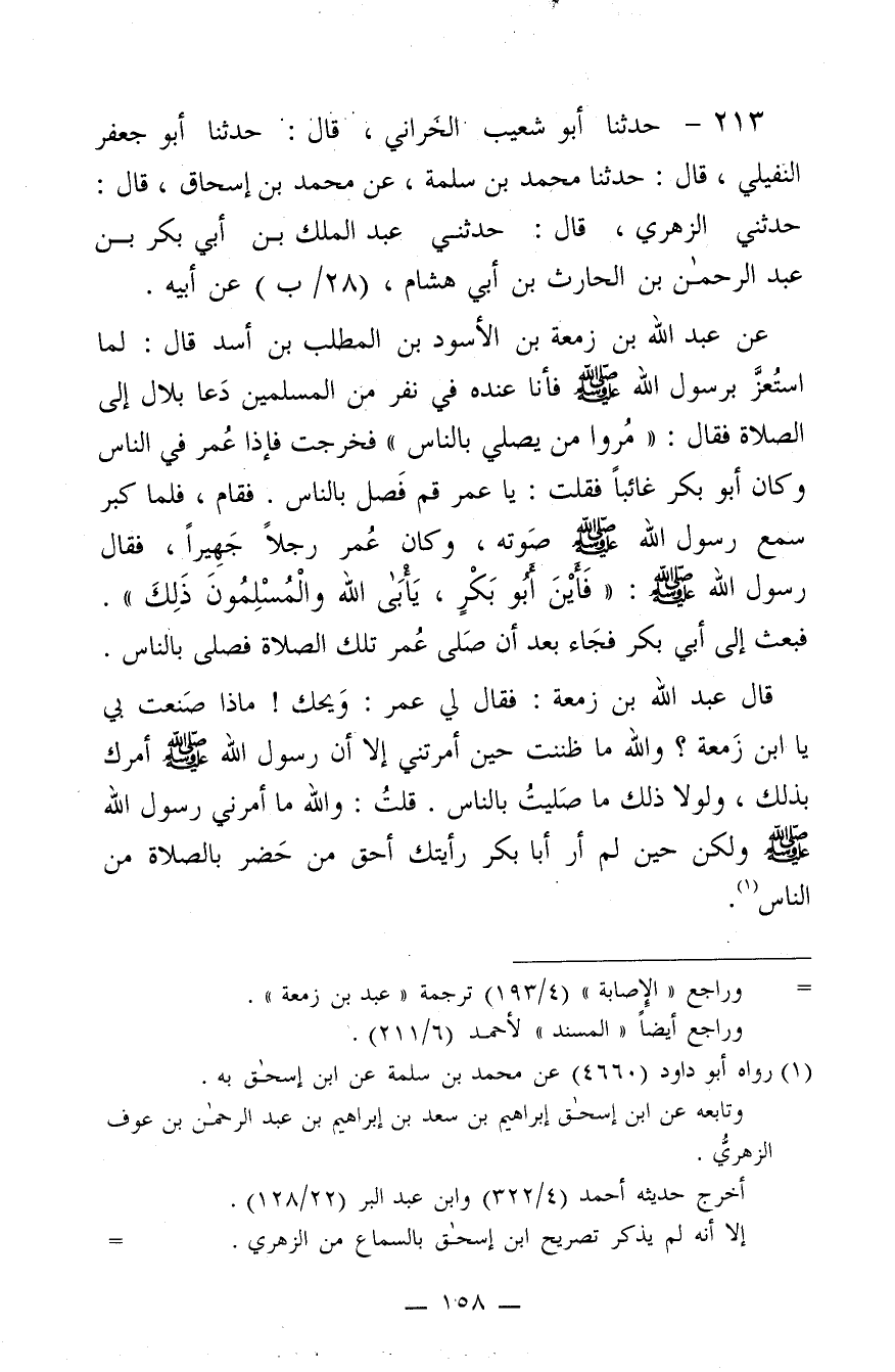 213 - حَدَّثَنَا أَبُو شُعَيْبٍ الْحَرَّانِيُّ، قَالَ: حَدَّثَنَا أَبُو جَعْفَرٍ النُّفَيْلِيُّ، قَالَ: حَدَّثَنَا مُحَمَّدُ بن سَلَمَةَ، عَنْ مُحَمَّدِ بن إِسْحَاقَ، قَالَ: حَدَّثَنِي الزُّهْرِيُّ، قَالَ: حَدَّثَنِي عَبْدُ الْمَلِكِ بن أَبِي بَكْرِ بن عَبْدِ الرَّحْمَنِ بن الْحَارِثِ بن أَبِي هِشَامٍ، عَنْ أَبِيهِ، عَنْ عَبْدِ اللَّهِ بن زَمْعَةَ بن الأَسْوَدِ بن الْمُطَّلِبِ بن أَسَدٍ، قَالَ: لَمَّا اسْتُعِزَّ بِرَسُولِ اللَّهِ صَلَّى اللَّهُ عَلَيْهِ وَسَلَّمَ، فَأَنَا عِنْدَهُ فِي نَفَرٍ مِنَ الْمُسْلِمِينَ، دَعَا بِلالُ إِلَى الصَّلاةِ، فَقَالَ:"مُرُوا مَنْ يُصَلِّي بِالنَّاسِ". فَخَرَجْتُ، فَإِذَا عُمَرُ فِي النَّاسِ، وَكَانَ أَبُو بَكْرٍ غَائِبًا، فَقُلْتُ: يَا عُمَرُ، قُمْ فَصَلِّ بِالنَّاسِ. فَقَامَ، فَلَمَّا كَبَّرَ سَمِعَ رَسُولُ اللَّهِ صَلَّى اللَّهُ عَلَيْهِ وَسَلَّمَ صَوْتَهُ، وَكَانَ عُمَرُ رَجُلا جَهِيرًا، فَقَالَ رَسُولُ اللَّهِ صَلَّى اللَّهُ عَلَيْهِ وَسَلَّمَ:"فَأَيْنَ أَبُو بَكْرٍ، يَأْبَى اللَّهُ وَالْمُسْلِمُونَ ذَلِكَ". فَبَعَثَ إِلَى أَبِي بَكْرٍ، فَجَاءَ بَعْدَ أَنْ صَلَّى عُمَرُ تِلْكَ الصَّلاةَ، فَصَلَّى بِالنَّاسِ. قَالَ عَبْدُ اللَّهِ بن زَمْعَةَ: فَقَالَ لِي عُمَرُ: وَيْحَكَ ! مَاذَا صَنَعْتَ بِي يَا ابْنَ زَمْعَةَ؟ وَاللَّهِ مَا ظَنَنْتُ حِينَ أَمَرْتَنِي، إِلا أَنَّ رَسُولَ اللَّهِ صَلَّى اللَّهُ عَلَيْهِ وَسَلَّمَ أَمَرَكَ بِذَلِكَ، وَلَوْلا ذَلِكَ مَا صَلَيَّتُ بِالنَّاسِ، قُلْتُ: وَاللَّهِ مَا أَمَرَنِي رَسُولُ اللَّهِ صَلَّى اللَّهُ عَلَيْهِ وَسَلَّمَ، وَلَكِنْ حِينَ لَمْ أَرَ أَبَا بَكْرٍ، رَأَيْتُكَ أَحَقَّ مَنْ حَضَرَ بِالصَّلاةِ مِنَ النَّاسِ.@