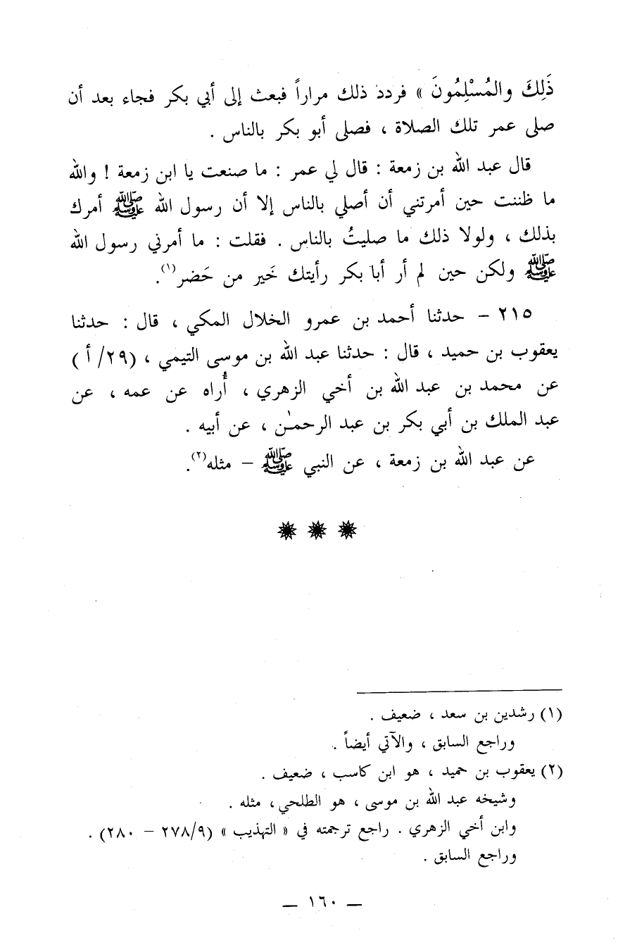 ذَلِكَ وَالْمُسْلِمُونَ". فَرَدَّدَ ذَلِكَ مِرَارًا، فَبَعَثَ إِلَى أَبِي بَكْرٍ، فَجَاءَ بَعْدَ أَنْ صَلَّى عُمَرُ تِلْكَ الصَّلاةَ، فَصَلَّى أَبُو بَكْرٍ بِالنَّاسِ، قَالَ عَبْدُ اللَّهِ بن زَمْعَةَ: قَالَ لِي عُمَرُ: مَا صَنَعْتَ يَا ابْنَ زَمْعَةَ ! وَاللَّهِ مَا ظَنَنْتُ حِينَ أَمَرْتَنِي أَنْ أُصَلِّيَ بِالنَّاسِ، إِلا أَنَّ رَسُولَ اللَّهِ صَلَّى اللَّهُ عَلَيْهِ وَسَلَّمَ أَمَرَكَ بِذَلِكَ، وَلَوْلا ذَلِكَ مَا صَلَّيْتُ بِالنَّاسِ، فَقُلْتُ: مَا أَمَرَنِي رَسُولُ اللَّهِ صَلَّى اللَّهُ عَلَيْهِ وَسَلَّمَ، وَلَكِنْ حِيَنَ لَمْ أَرَ أَبَا بَكْرٍ، رَأَيْتُكَ خَيْرَ مَنْ حَضَرَ. حَدَّثَنَا أَحْمَدُ بن عَمْرٍو الْخَلالُ الْمَكِّيُّ، قَالَ: حَدَّثَنَا يَعْقُوبُ بن حُمَيْدٍ، قَالَ: حَدَّثَنَا عَبْدُ اللَّهِ بن مُوسَى التَّيْمِيُّ، عَنْ مُحَمَّدِ بن عَبْدِ اللَّهِ بن أَخِي الزُّهْرِيِّ، أُرَاهُ عَنْ عَمِّهِ، عَنْ عَبْدِ الْمَلِكِ بن أَبِي بَكْرِ بن عَبْدِ الرَّحْمَنِ، عَنْ أَبِيهِ، عَنْ عَبْدِ اللَّهِ بن زَمْعَةَ، عَنِ النَّبِيِّ صَلَّى اللَّهُ عَلَيْهِ وَسَلَّمَ، مِثْلَهُ ).@