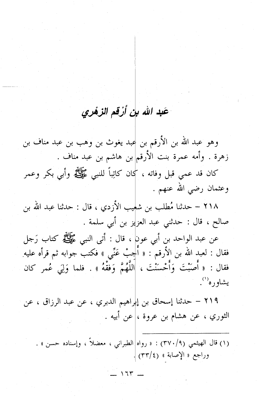 218 - حَدَّثَنَا مُطَّلِبُ بن شُعَيْبٍ الأَزْدِيُّ، قَالَ: حَدَّثَنَا عَبْدُ اللَّهِ بن صَالِحٍ، قَالَ: حَدَّثَنِي عَبْدُ الْعَزِيزِ بن أَبِي سَلَمَةَ، عَنْ عَبْدِ الْوَاحِدِ بن أَبِي عَوْنٍ، قَالَ: أَتَى النَّبِيَّ صَلَّى اللَّهُ عَلَيْهِ وَسَلَّمَ كِتَابُ رَجُلٍ، فَقَالَ لِعَبْدِ اللَّهِ بن الأَرْقَمِ:"أَجِبْ عَنِّي"، فَكَتَبَ جَوَابَهُ، ثُمَّ قَرَأَهُ عَلَيْهِ، فَقَالَ صَلَّى اللَّهُ عَلَيْهِ وَسَلَّمَ:"أَصَبْتَ وَأَحْسَنْتَ، اللَّهُمَّ وَفِّقْهُ". فَلَمَّا وَلِيَ عُمَرُ كَانَ يُشَاوِرُهُ.
