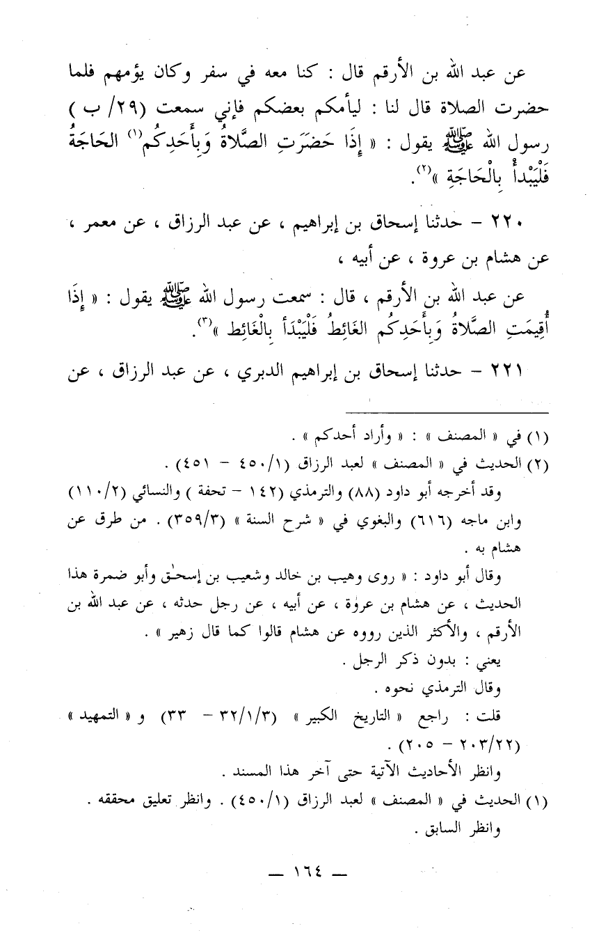 220 - حَدَّثَنَا إِسْحَاقُ بن إِبْرَاهِيمَ، عَنْ عَبْدِ الرَّزَّاقِ، عَنْ مَعْمَرٍ، عَنْ هِشَامِ بن عُرْوَةَ، عَنْ أَبِيهِ، عَنْ عَبْدِ اللَّهِ بن الأَرْقَمِ، قَالَ: سَمِعْتُ رَسُولَ اللَّهِ صَلَّى اللَّهُ عَلَيْهِ وَسَلَّمَ، يَقُولُ:"إِذَا أُقِيمَتِ الصَّلاةُ وَبِأَحَدِكُمُ الْغَائِطُ، فَلْيَبْدَأْ بِالْغَائِطِ".