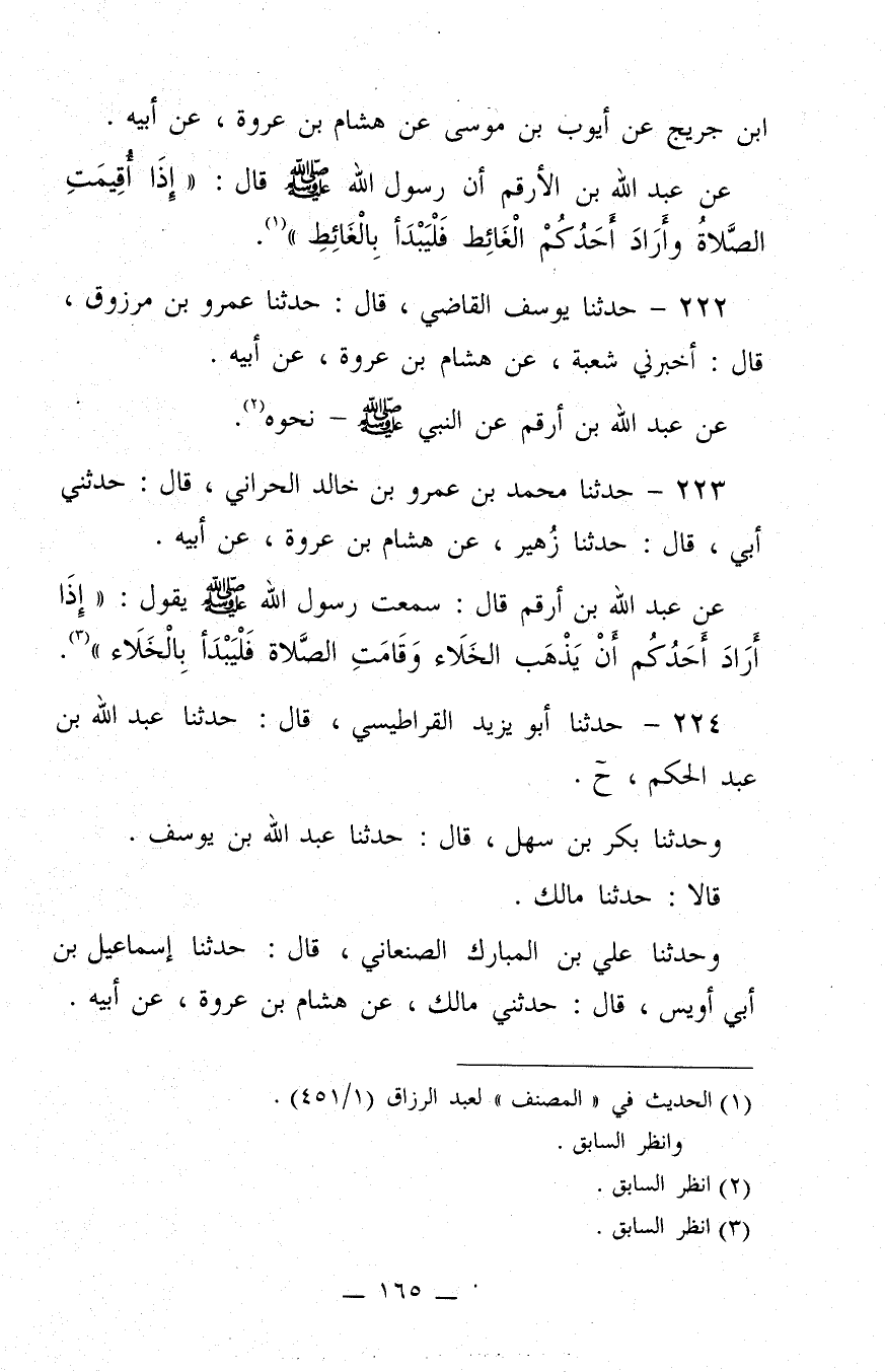 223 - حَدَّثَنَا مُحَمَّدُ بن عَمْرِو بن خَالِدٍ الْحَرَّانِيُّ، قَالَ: حَدَّثَنِي أَبِي، قَالَ: حَدَّثَنَا زُهَيْرٌ، عَنْ هِشَامِ بن عُرْوَةَ، عَنْ أَبِيهِ، عَنْ عَبْدِ اللَّهِ بن أَرْقَمَ، قَالَ: سَمِعْتُ رَسُولَ اللَّهِ صَلَّى اللَّهُ عَلَيْهِ وَسَلَّمَ، يَقُولُ:"إِذَا أَرَادَ أَحَدُكُمْ أَنْ يَذْهَبَ الْخَلاءَ، وَقَامَتِ الصَّلاةُ، فَلْيَبْدَأْ بِالْخَلاءِ".