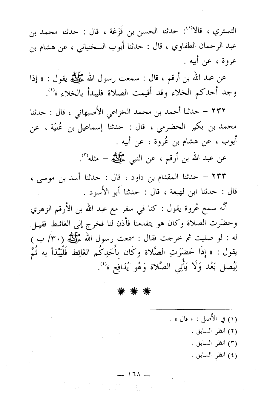 التُّسْتَرِيُّ، قَالا: حَدَّثَنَا الْحَسَنُ بن قَزَعَةَ، قَالَ: حَدَّثَنَا مُحَمَّدُ بن عَبْدِ الرَّحْمَنِ الطُّفَاوِيُّ، قَالَ: حَدَّثَنَا أَيُّوبُ السِّخْتِيَانِيُّ، عَنْ هِشَامِ بن عُرْوَةَ، عَنْ أَبِيهِ، عَنْ عَبْدِ اللَّهِ بن أَرْقَمَ، قَالَ: سَمِعْتُ رَسُولَ اللَّهِ صَلَّى اللَّهُ عَلَيْهِ وَسَلَّمَ، يَقُولُ:"إِذَا وَجَدَ أَحَدُكُمُ الْخَلاءَ وَقَدْ أُقِيمَتِ الصَّلاةُ، فَلْيَبْدَأْ بِالْخَلاءِ". حَدَّثَنَا أَحْمَدُ بن مُحَمَّدٍ الْخُزَاعِيُّ الأَصْبَهَانِيُّ، قَالَ: حَدَّثَنَا مُحَمَّدُ بن بُكَيْرٍ الْحَضْرَمِيُّ، قَالَ: حَدَّثَنَا إِسْمَاعِيلُ بن عُلَيَّةَ، عَنْ أَيُّوبَ، عَنْ هِشَامِ بن عُرْوَةَ، عَنْ أَبِيهِ، عَنْ عَبْدِ اللَّهِ بن أَرْقَمَ، عَنِ النَّبِيِّ صَلَّى اللَّهُ عَلَيْهِ وَسَلَّمَ مِثْلَهُ.