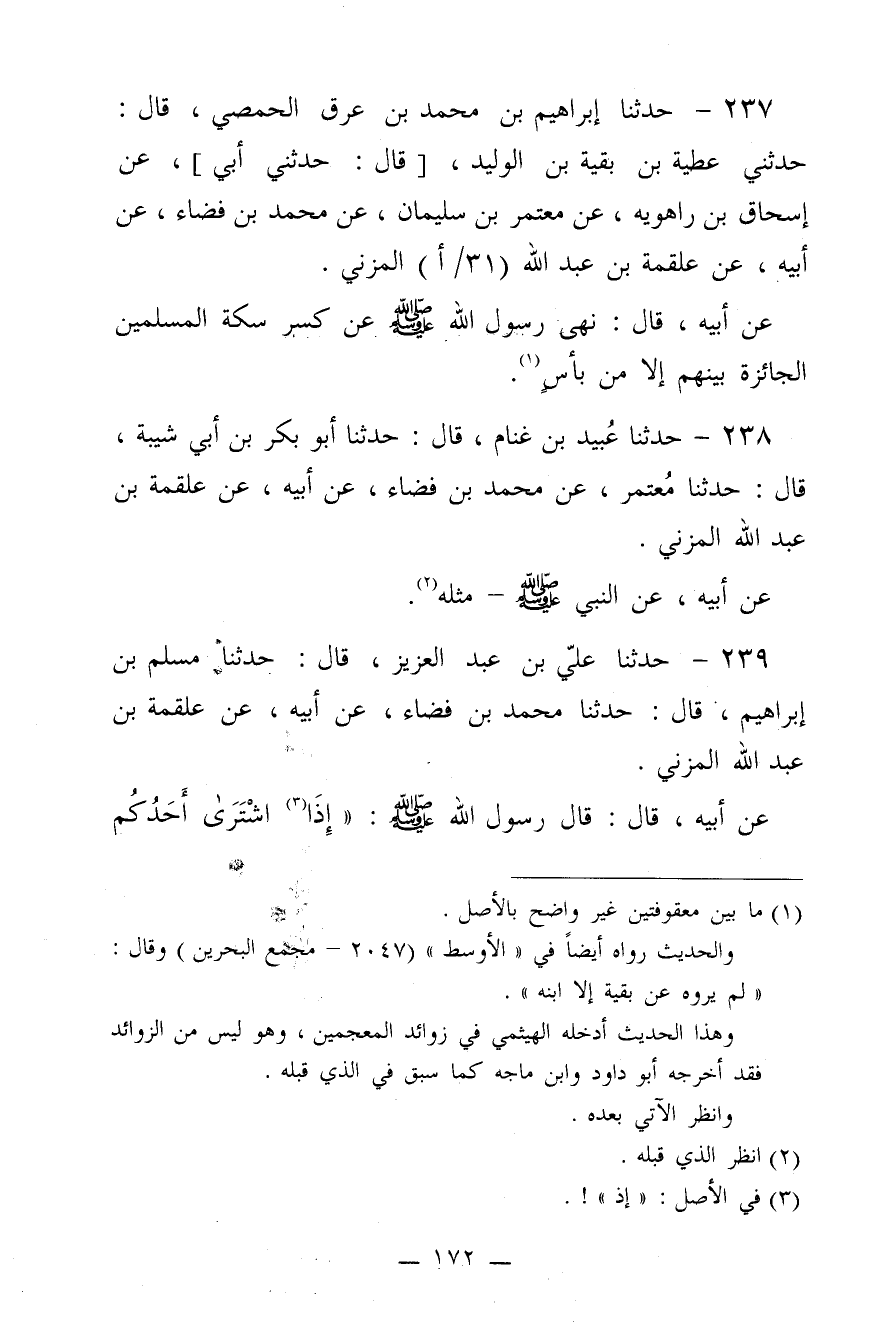 237 - حَدَّثَنَا إِبْرَاهِيمُ بن مُحَمَّدِ بن عِرْقٍ الْحِمْصِيُّ، قَالَ: حَدَّثَنِي عَطِيَّةُ بن بَقِيَّةَ بن الْوَلِيدِ، قَالَ: حَدَّثَنِي أَبِي، عَنْ إِسْحَاقَ بن رَاهَوَيْهِ، عَنْ مُعْتَمِرِ بن سُلَيْمَانَ، عَنْ مُحَمَّدِ بن فَضَاءٍ، عَنْ أَبِيهِ، عَنْ عَلْقَمَةَ بن عَبْدِ اللَّهِ الْمُزَنِيِّ، عَنْ أَبِيهِ، قَالَ:"نَهَى رَسُولُ اللَّهِ صَلَّى اللَّهُ عَلَيْهِ وَسَلَّمَ عَنْ كَسْرِ سِكَّةِ الْمُسْلِمِينَ الْجَائِزَةُ بَيْنَهُمْ، إِلا مِنْ بَأْسٍ". حَدَّثَنَا عُبَيْدُ بن غَنَّامٍ، قَالَ: حَدَّثَنَا أَبُو بَكْرِ بن أَبِي شَيْبَةَ، قَالَ: حَدَّثَنَا مُعْتَمِرٌ، عَنْ مُحَمَّدِ بن فَضَاءٍ، عَنْ أَبِيهِ، عَنْ عَلْقَمَةَ بن عَبْدِ اللَّهِ الْمُزَنِيِّ، عَنْ أَبِيهِ، عَنِ النَّبِيِّ صَلَّى اللَّهُ عَلَيْهِ وَسَلَّمَ مِثْلَهُ.