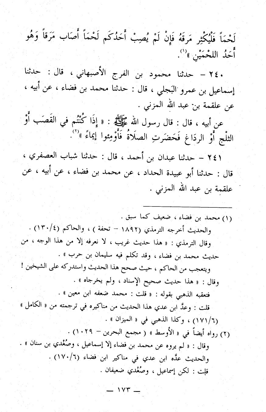 241 - حَدَّثَنَا عَبْدَانُ بن أَحْمَدَ، قَالَ: حَدَّثَنَا شَبَابٌ الْعُصْفِرِيُّ، قَالَ: حَدَّثَنَا أَبُو عُبَيْدَةَ الْحَدَّادُ، عَنْ مُحَمَّدِ بن فَضَاءٍ، عَنْ أَبِيهِ، عَنْ عَلْقَمَةَ بن عَبْدِ اللَّهِ الْمُزَنِيِّ،@