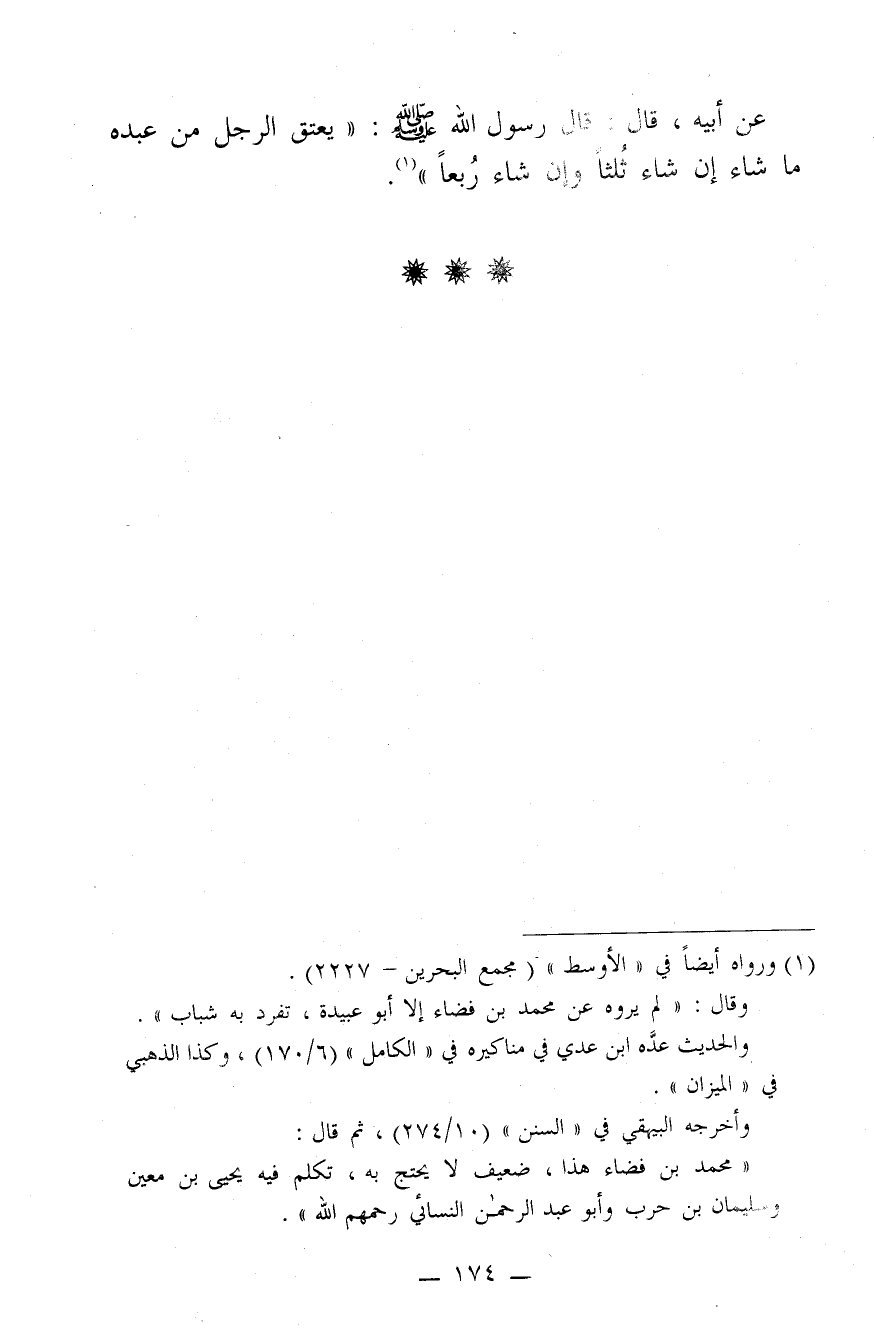 عَنْ أَبِيهِ، قَالَ: قَالَ رَسُولُ اللَّهِ صَلَّى اللَّهُ عَلَيْهِ وَسَلَّمَ:"يَعْتِقُ الرّجَلُ مِنْ عَبْدِهِ مَا شَاءَ، إِنْ شَاءَ ثُلْثًا، وَإِنْ شَاءَ رُبْعًا".@