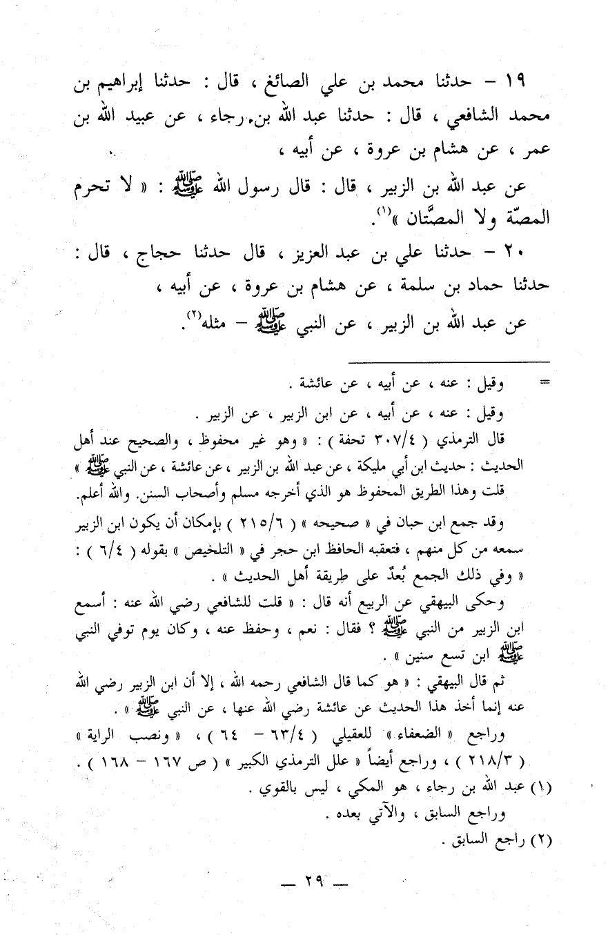 19 - حَدَّثَنَا مُحَمَّدُ بن عَلِيٍّ الصَّائِغُ، قَالَ: حَدَّثَنَا إِبْرَاهِيمُ بن مُحَمَّدٍ الشَّافِعِيُّ، قَالَ: حَدَّثَنَا عَبْدُ اللَّهِ بن رَجَاءٍ، عَنْ عُبَيْدِ اللَّهِ بن عُمَرَ، عَنْ هِشَامِ بن عُرْوَةَ، عَنْ أَبِيهِ، عَنْ عَبْدِ اللَّهِ بن الزُّبَيْرِ، قَالَ: قَالَ رَسُولُ اللَّهِ صَلَّى اللَّهُ عَلَيْهِ وَسَلَّمَ:"لا تُحَرِّمُ الْمَصَّةُ، وَلا الْمَصَّتَانِ". حَدَّثَنَا عَلِيُّ بن عَبْدِ الْعَزِيزِ، قَالَ: حَدَّثَنَا حَجَّاجٌ، قَالَ: حَدَّثَنَا حَمَّادُ بن سَلَمَةَ، عَنْ هِشَامِ بن عُرْوَةَ، عَنْ أَبِيهِ، عَنْ عَبْدِ اللَّهِ بن الزُّبَيْرِ، عَنِ النَّبِيِّ صَلَّى اللَّهُ عَلَيْهِ وَسَلَّمَ، مِثْلَهُ.@