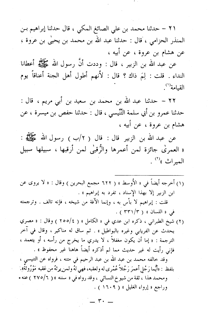 22 - حَدَّثَنَا عَبْدُ اللَّهِ بن مُحَمَّدِ بن سَعِيدِ بن أَبِي مَرْيَمَ، قَالَ: حَدَّثَنَا عَمْرُو بن أَبِي سَلَمَةَ التَّنَّيسِيُّ، قَالَ: حَدَّثَنَا حَفْصُ بن مَيْسَرَةَ، عَنْ هِشَامِ بن عُرْوَةَ، عَنْ أَبِيهِ، عَنْ عَبْدِ اللَّهِ بن الزُّبَيْرِ، قَالَ: قَالَ رَسُولُ اللَّهِ صَلَّى اللَّهُ عَلَيْهِ وَسَلَّمَ:"الْعُمْرَى جَائِزَةٌ لِمَنْ أَعْمَرَهَا، وَالرُّقْبَى لِمَنْ أَرْقَبَهَا، سَبِيلُهَا سَبِيلُ الْمِيرَاثِ".@