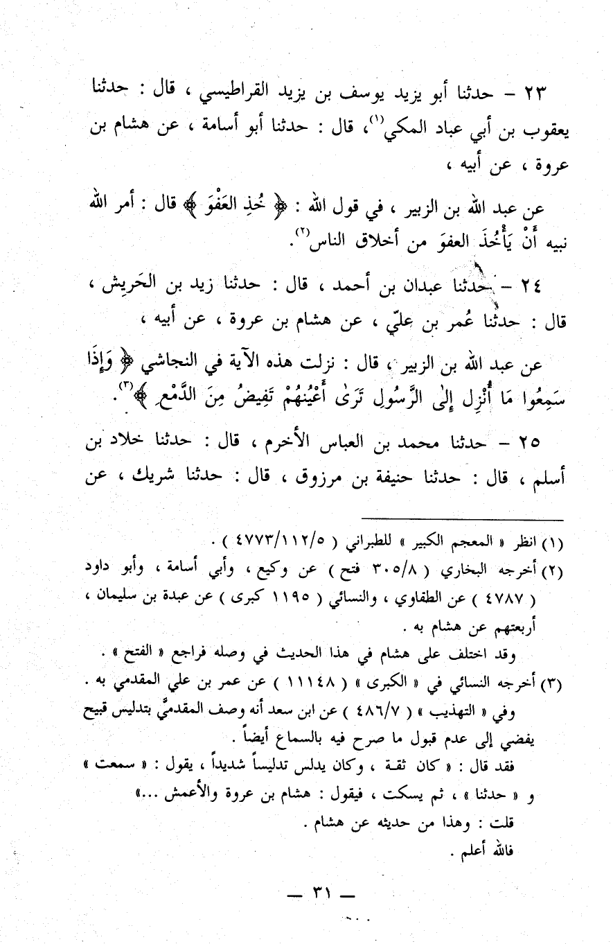 23 - حَدَّثَنَا أَبُو يَزِيدَ يُوسُفُ بن يَزِيدَ الْقَرَاطِيسِيُّ، قَالَ: حَدَّثَنَا يَعْقُوبُ بن أَبِي عَبَّادٍ الْمَكِّيُّ، قَالَ: حَدَّثَنَا أَبُو أُسَامَةَ، عَنْ هِشَامِ بن عُرْوَةَ، عَنْ أَبِيهِ، عَنْ عَبْدِ اللَّهِ بن الزُّبَيْرِ، فِي قَوْلِ اللَّهِ: ?خُذِ العَفْوَ?[الأعراف آية 199]. قَالَ:"أَمَرَ اللَّهُ نَبِيَّهُ أَنْ يَأْخُذَ الْعَفْوَ مِنْ أَخْلاقِ النَّاسِ".