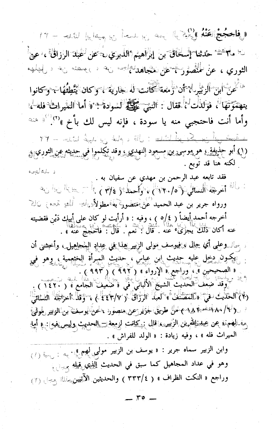 30 - حَدَّثَنَا إِسْحَاقُ بن إِبْرَاهِيمَ الدَّبَرِيُّ، عَنْ عَبْدِ الرَّزَّاقِ، عَنِ الثَّوْرِيِّ، عَنْ مَنْصُورٍ، عَنْ مُجَاهِدٍ، عَنِ ابْنِ الزُّبَيْرِ، أَنَّ زَمْعَةَ كَانَتْ لَهُ جَارِيَةً، وَكَانَ يَتَّطِئُهَا، وَكَانُوا يَتَّهِمُونَهَا، فَوَلَدَتْ، فَقَالَ النَّبِيُّ صَلَّى اللَّهُ عَلَيْهِ وَسَلَّمَ لِسَوْدَةَ:"أَمَّا الْمِيرَاثُ فَلَهُ، وَأَمَّا أَنْتِ فَاحْتَجِبِي مِنْهُ يَا سَوْدَةُ، فَإِنَّهُ لَيْسَ لَكَ بِأَخٍ".@
