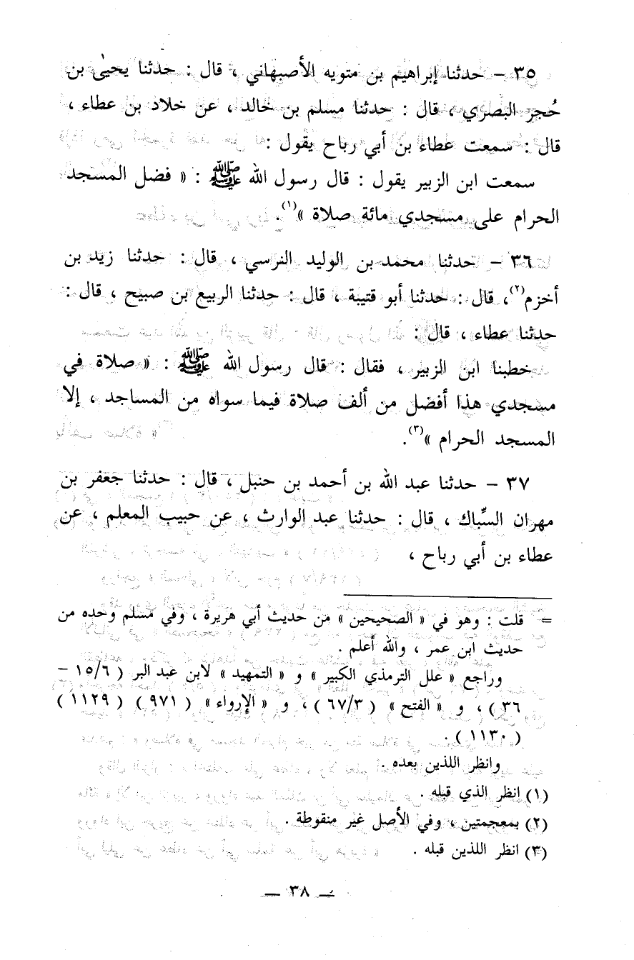 35 - حَدَّثَنَا إِبْرَاهِيمُ بن مَتْوَيْهِ الأَصْبَهَانِيُّ، قَالَ: حَدَّثَنَا يَحْيَى بن حُجْرٍ الْبَصْرِيُّ، قَالَ: حَدَّثَنَا مُسْلِمُ بن خَالِدٍ، عَنْ خَلادِ بن عَطَاءٍ، قَالَ: سَمِعْتُ عَطَاءَ بن أَبِي رَبَاحٍ، يَقُولُ: سَمِعْتُ ابْنَ الزُّبَيْرِ، يَقُولُ: قَالَ رَسُولُ اللَّهِ صَلَّى اللَّهُ عَلَيْهِ وَسَلَّمَ:"فَضْلُ الْمَسْجِدِ الْحَرَامِ عَلَى مَسْجِدِي مَائَةُ صَلاةٍ".