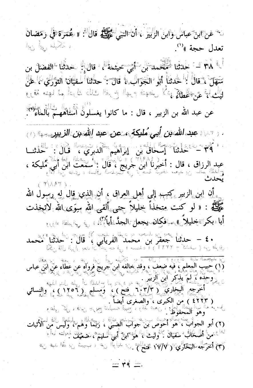 39 - حَدَّثَنَا إِسْحَاقُ بن إِبْرَاهِيمَ الدَّبَرِيُّ، قَالَ: حَدَّثَنَا عَبْدُ الرَّزَّاقِ، قَالَ: أَخْبَرَنَا ابْنُ جُرَيْجٍ، قَالَ: سَمِعْتُ ابْنَ أَبِي مُلَيْكَةَ يُحَدِّثُ، أَنَّ ابْنَ الزُّبَيْرِ كَتَبَ إِلَى أَهْلِ الْعِرَاقِ، أَنَّ الَّذِي قَالَ لَهُ رَسُولُ اللَّهِ صَلَّى اللَّهُ عَلَيْهِ وَسَلَّمَ:"لَوْ كُنْتُ مُتَّخِذًا خَلِيلا حَتَّى أَلْقَى اللَّهَ سِوَى اللَّهِ، لاتَّخَذْتُ أَبَا بَكْرٍ خَلِيلا". فَكَانَ يَجْعَلُ الْجَدَّ أَبًا.