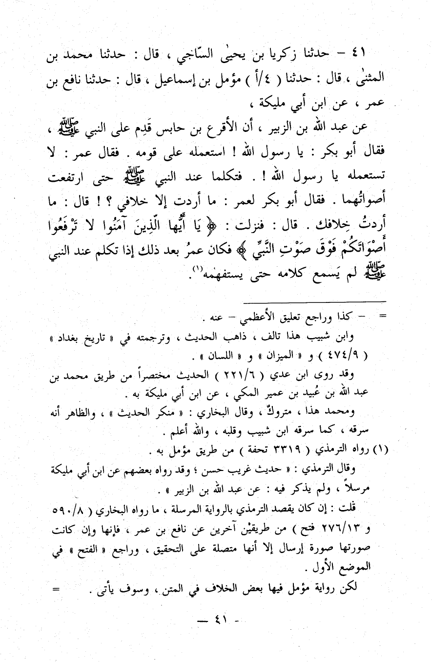 41 - حَدَّثَنَا زَكَرِيَّا بن يَحْيَى السَّاجِيُّ، قَالَ: حَدَّثَنَا مُحَمَّدُ بن الْمُثَنَّى، قَالَ: حَدَّثَنَا مُؤَمِّلُ بن إِسْمَاعِيلَ، قَالَ: حَدَّثَنَا نَافِعُ بن عُمَرَ، عَنِ ابْنِ أَبِي مُلَيْكَةَ، عَنْ عَبْدِ اللَّهِ بن الزُّبَيْرِ،"أَنَّ الأَقْرَعَ بن حَابِسٍ قَدِمَ عَلَى النَّبِيِّ صَلَّى اللَّهُ عَلَيْهِ وَسَلَّمَ، فَقَالَ أَبُو بَكْرٍ: يَا رَسُولَ اللَّهِ، اسْتَعْمِلْهُ عَلَى قَوْمِهِ، فَقَالَ عُمَرُ: لا تَسْتَعْمِلْهُ يَا رَسُولَ اللَّهِ. فَتَكَلَّمَا عِنْدَ النَّبِيِّ صَلَّى اللَّهُ عَلَيْهِ وَسَلَّمَ، حَتَّى ارْتَفَعَتْ أَصْوَاتُهُمَا. فَقَالَ أَبُو بَكْرٍ لِعُمَرَ: مَا أَرَدْتَ إِلا خِلافِي؟ ! قَالَ: مَا أَرَدْتُ خِلافَكَ. قَالَ: فَنَزَلَتْ: ?يَا أَيُّهَا الَّذِينَ آمَنُوا لا تَرْفَعُوا أَصْوَاتَكُمْ فَوْقَ صَوْتِ النَّبِيِّ?[الحجرات آية 2]، فَكَانَ عُمَرُ بَعْدَ ذَلِكَ إِذَا تَكَلَّمَ عِنْدَ النَّبِيِّ صَلَّى اللَّهُ عَلَيْهِ وَسَلَّمَ لَمْ يَسْمَعْ كَلامَهُ، حَتَّى يَسْتَفْهِمَهُ".@