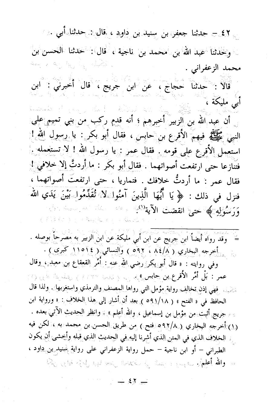 42 - حَدَّثَنَا جَعْفَرُ بن سُنَيْدِ بن دَاوُدَ، قَالَ: حَدَّثَنَا أَبِي، وَحَدَّثَنَا عَبْدُ اللَّهِ بن مُحَمَّدِ بن نَاجِيَةَ، قَالَ: حَدَّثَنَا الْحَسَنُ بن مُحَمَّدٍ الزَّعْفَرَانِيُّ، قَالا: حَدَّثَنَا حَجَّاجٌ، عَنِ ابْنِ جُرَيْجٍ، قَالَ: أَخْبَرَنِي: ابْنُ أَبِي مُلَيْكَةَ، أَنَّ عَبْدَ اللَّهِ بن الزُّبَيْرِ أَخْبَرَهُمْ،"أَنَّهُ قَدِمَ رَكْبٌ مِنْ بني تَمِيمٍ عَلَى النَّبِيِّ صَلَّى اللَّهُ عَلَيْهِ وَسَلَّمَ، فِيهِمُ الأَقْرَعُ بن حَابِسٍ، فَقَالَ أَبُو بَكْرٍ: يَا رَسُولَ اللَّهِ، اسْتَعْمِلِ الأَقْرَعَ عَلَى قَوْمِهِ. فَقَالَ عُمَرُ: يَا رَسُولَ اللَّهِ، لا تَسْتَعْمِلْهُ. فَتَنَازَعَا حَتَّى ارْتَفَعَتْ أَصْوَاتُهُمَا. فَقَالَ أَبُو بَكْرٍ: مَا أَرَدْتَ إِلا خِلافِي ! فَقَالَ عُمَرُ: مَا أَرَدْتُ خِلافَكَ. فَتَمَارَيَا، حَتَّى ارْتَفَعَتْ أَصْوَاتُهُمَا، فَنَزَلَ فِي ذَلِكَ: ?يَا أَيُّهَا الَّذِينَ آمَنُوا لا تُقَدِّمُوا بَيْنَ يَدَيِ اللَّهِ وَرَسُولِهِ?[الحجرات آية 1]، حَتَّى انْقَضَتِ الآيَةُ".@