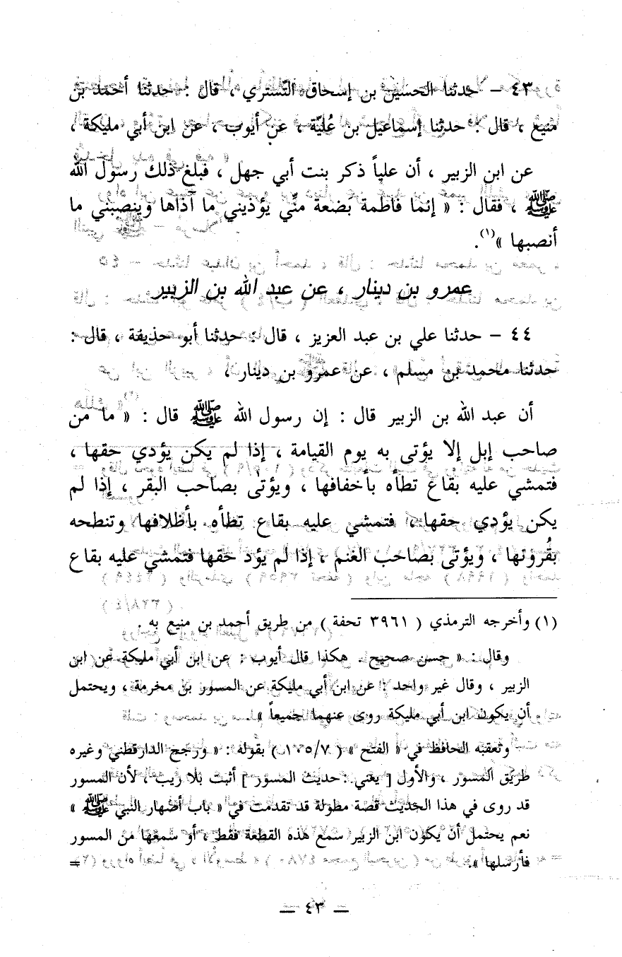 43 - حَدَّثَنَا الْحُسَيْنُ بن إِسْحَاقَ التُّسْتُرِيُّ، قَالَ: حَدَّثَنَا أَحْمَدُ بن مَنِيعٍ، قَالَ: حَدَّثَنَا إِسْمَاعِيلُ ابْنُ عُلَيَّةَ، عَنْ أَيُّوبَ، عَنِ ابْنِ أَبِي مُلَيْكَةَ، عَنِ ابْنِ الزُّبَيْرِ، أَنَّ عَلِيًّا ذَكَرَ بنتَ أَبِي جَهْلٍ، فَبَلَغَ ذَلِكَ رَسُولَ اللَّهِ صَلَّى اللَّهُ عَلَيْهِ وَسَلَّمَ، فَقَالَ:"إِنَّمَا فَاطِمَةُ بَضْعَةٌ مِنِّي، يُؤْذِينِي مَا آذَاهَا، وَيُنْصِبُنِي مَا أَنْصَبَهَا"