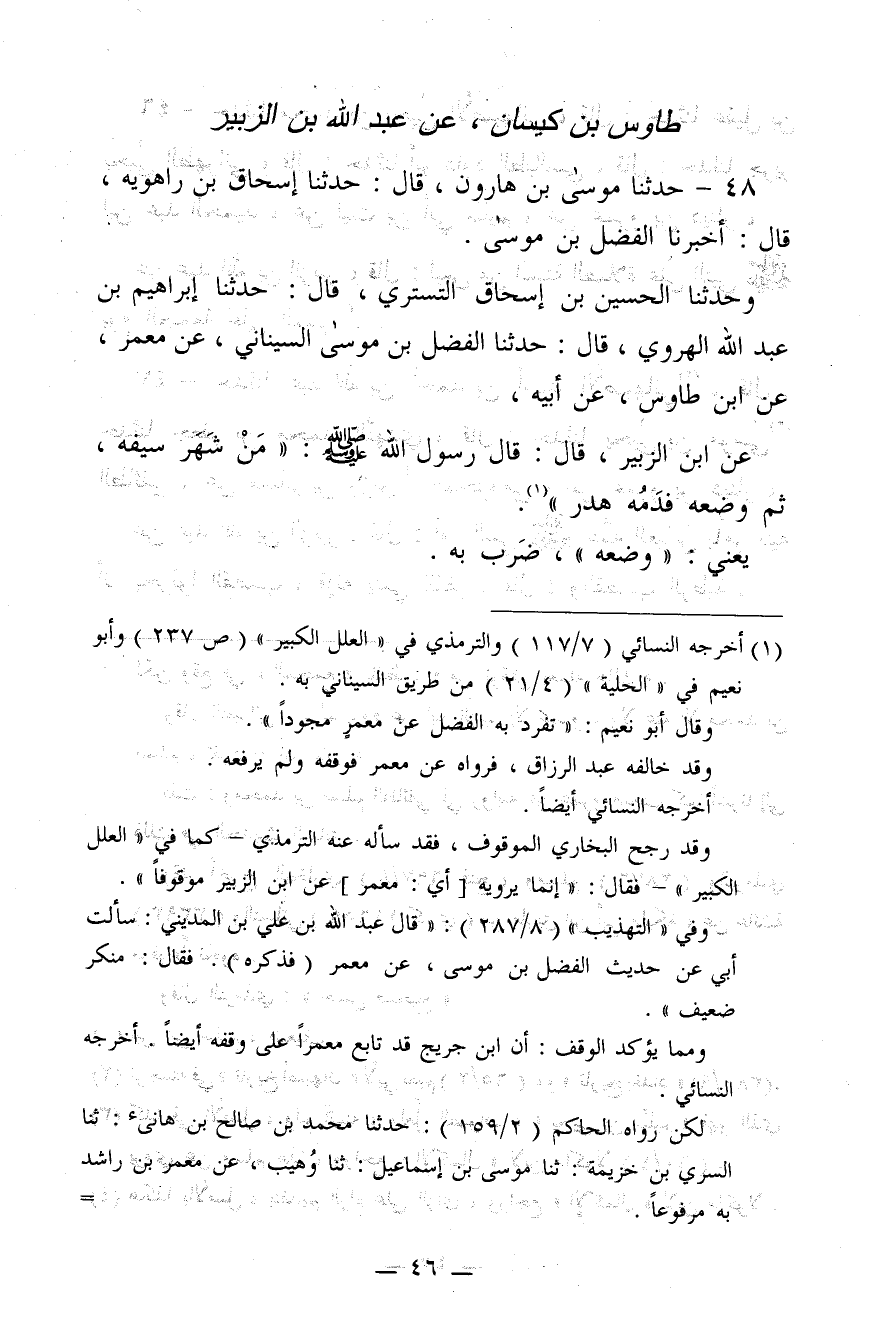 48 - حَدَّثَنَا مُوسَى بن هَارُونَ، قَالَ: حَدَّثَنَا إِسْحَاقُ بن رَاهَوَيْهِ، قَالَ: أَخْبَرَنَا الْفَضْلُ بن مُوسَى، وَحَدَّثَنَا الْحُسَيْنُ بن إِسْحَاقَ التُّسْتَرِيُّ، قَالَ: حَدَّثَنَا إِبْرَاهِيمُ بن عَبْدِ اللَّهِ الْهَرَوِيُّ، قَالَ: حَدَّثَنَا الْفَضْلُ بن مُوسَى السّينَانِيُّ، عَنْ مَعْمَرٍ، عَنِ ابْنِ طَاوُسٍ، عَنْ أَبِيهِ، عَنِ ابْنِ الزُّبَيْرِ، قَالَ: قَالَ رَسُولُ اللَّهِ صَلَّى اللَّهُ عَلَيْهِ وَسَلَّمَ:"مَنْ شَهِرَ سَيْفَهُ، ثُمَّ وَضَعَهُ، فَدَمُهُ هَدَرٌ". يَعْنِي: وَضَعَهُ، ضَرَبَ بِهِ.@
